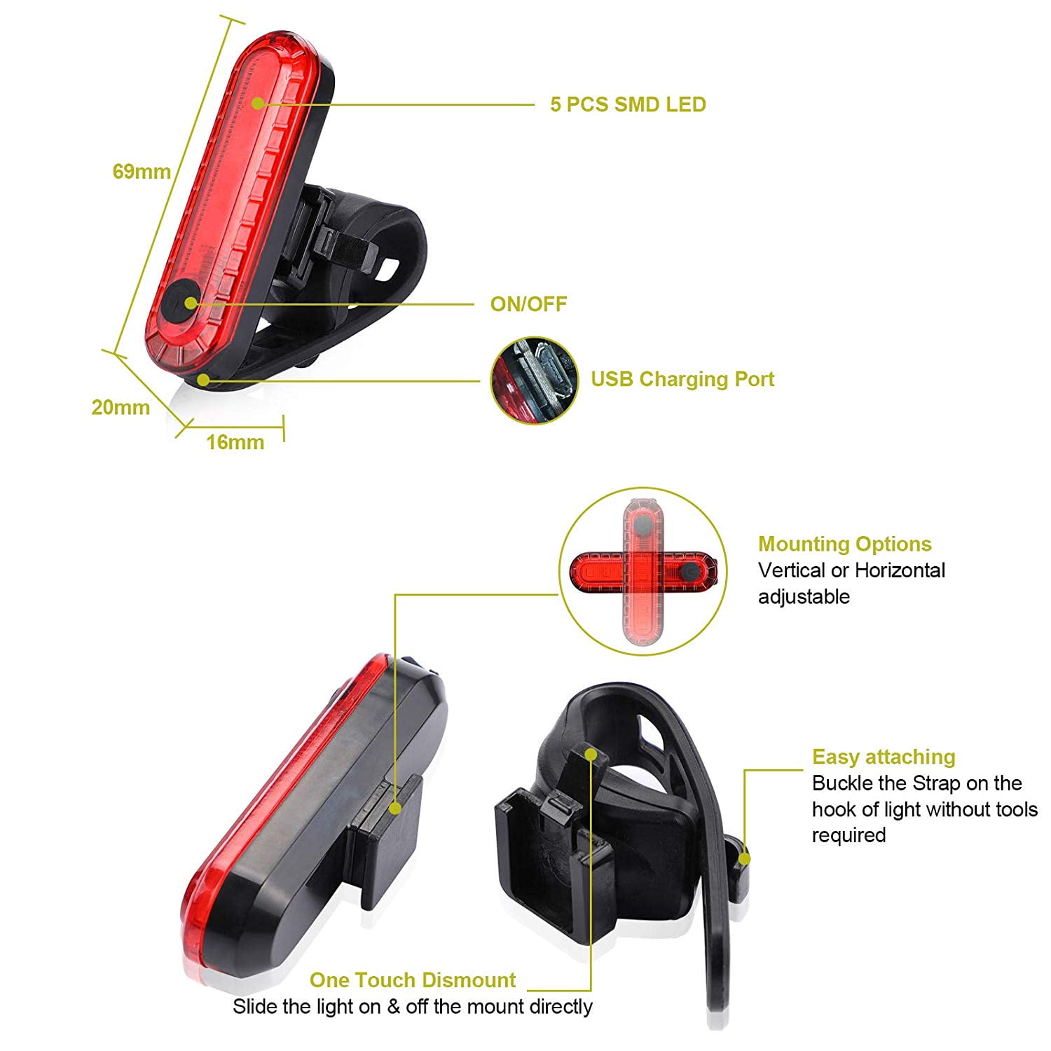 Coolmade USB Rechargeable LED Bike Tail Light 2 Pack, Bright Bicycle Rear Cycling Safety Flashlight, 330mah Lithium Battery, 4 Light Mode Options, Water Resistant IPX4(2 USB Cables Included)