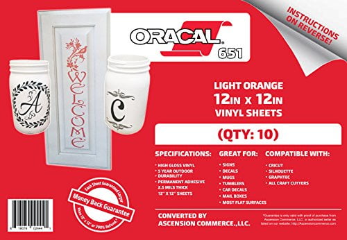 High quality Oracal 651 Craft Vinyl SheetsPerfect for CraftingOracal 651 vinyl is perfect for your crafting needs. Oracal film is compatible with all craft cutters, including the Cricut, Silhouette, Xyron, Craft ROBO, Graphtec, and more. It is a intermediate calendared vinyl, measuring at 2.5 mils in thickness. Manufactured in the United States, this is a high quality vinyl with consistent results. Easy to weed and durable, Oracal 651 is ideal for use on tumblers, window decals, car decals, signs, stencils, scrapbooking, or any other permanent application with a semi-smooth surface. The repositionable, pressure-sensitive adhesive means the media can be moved during a dry application and lightly repositioned it until it’s just right. This Light Orange vinyl has a gloss finish that truly stands out from the competition.FeaturesShips flat with a cardboard stiffening insertIncludes full color instruction sheetsFinish: GlossyRated for 5 years outdoor durabilityWaterproofHandwash safeCompatible with all craft cutters: Cricut, Silhouette, Xyron, Craft ROBO, Graphtec, and moreAdhesive: Solvent-based, PermanentSheet Size: 12" x 12"Number of Sheets: 10(10 Sheets) Oracal 651 Light Orange Adhesive Craft Vinyl for Cricut, Silhouette, Cameo, Craft Cutters, Printers, and Decals – 12" x 12" – Gloss Finish – Outdoor and Permanent