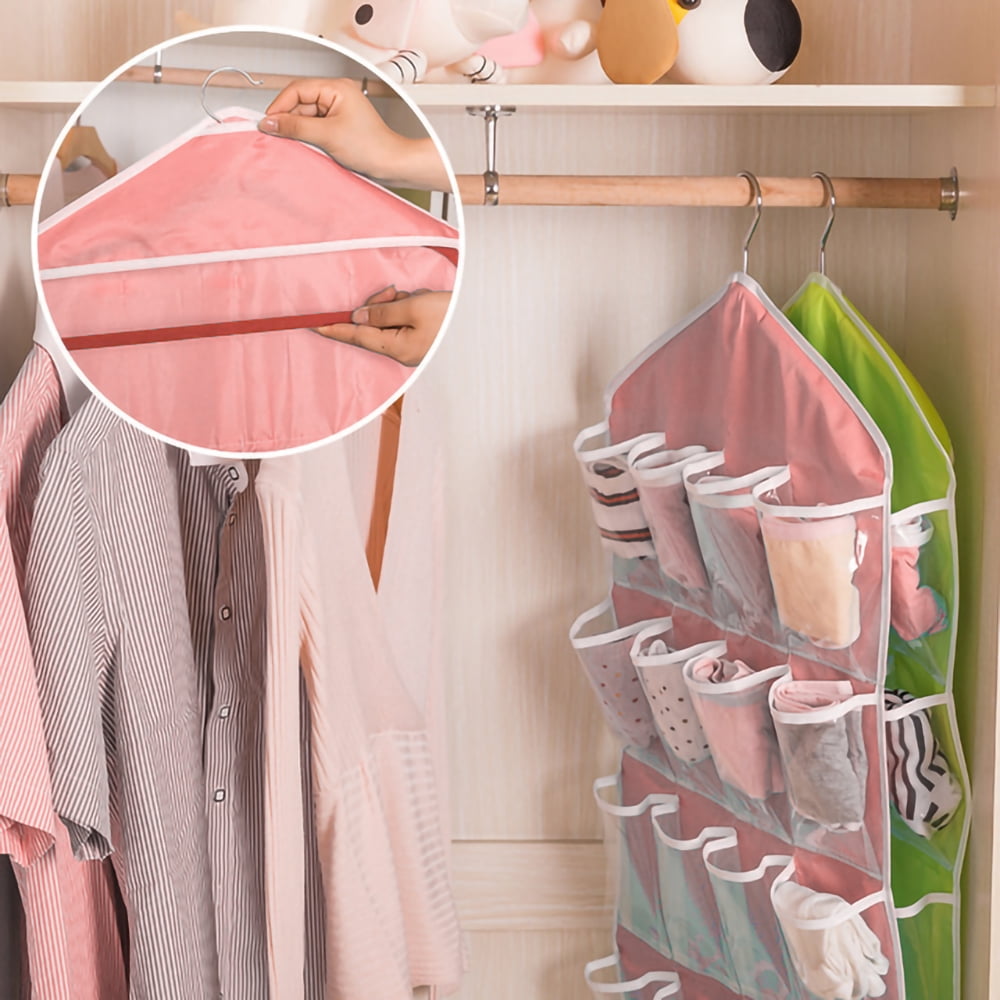 Store underwear, bras, socks, necklaces, sunglasses, makeup, bobby pins, watches, gloves, bracelets, other everyday items, and rolled-up t-shirts on the hanging organizer.