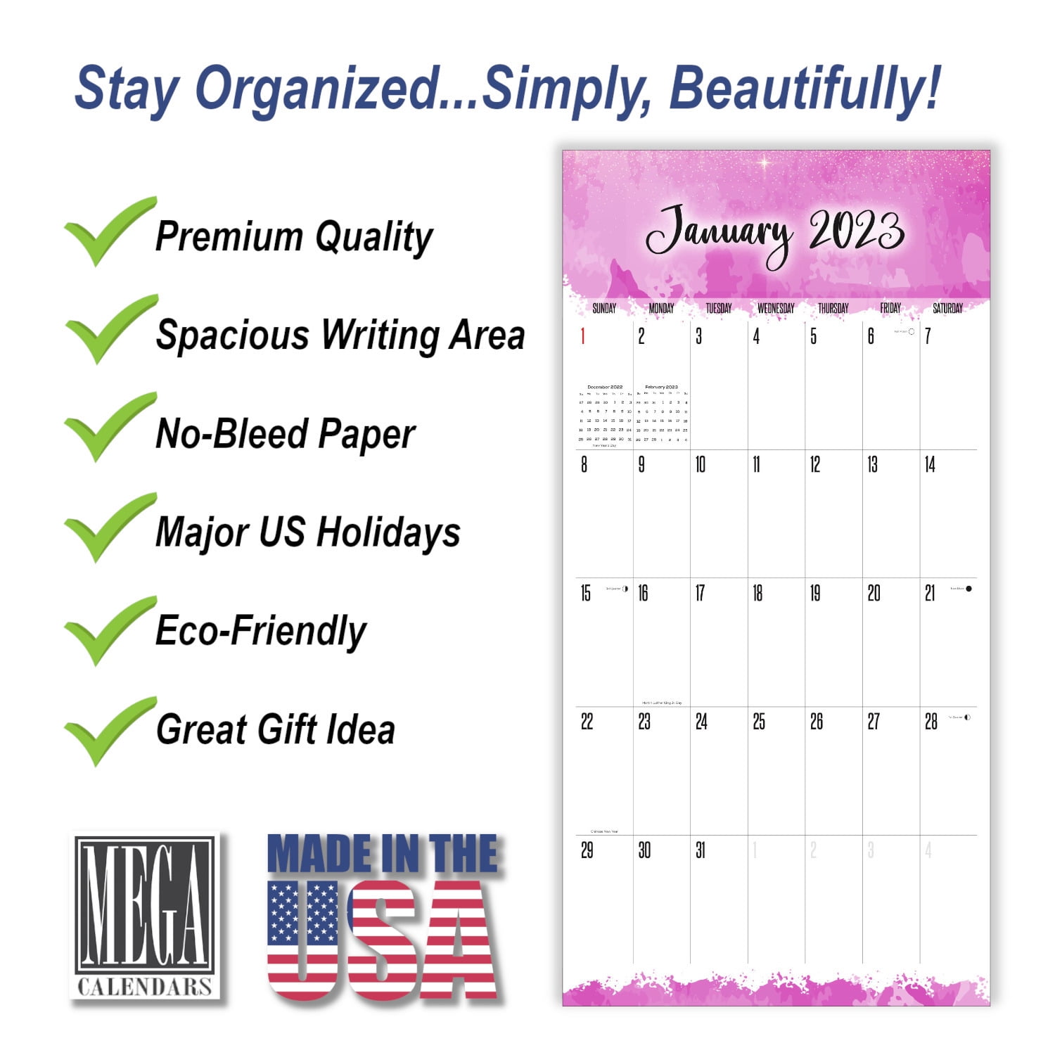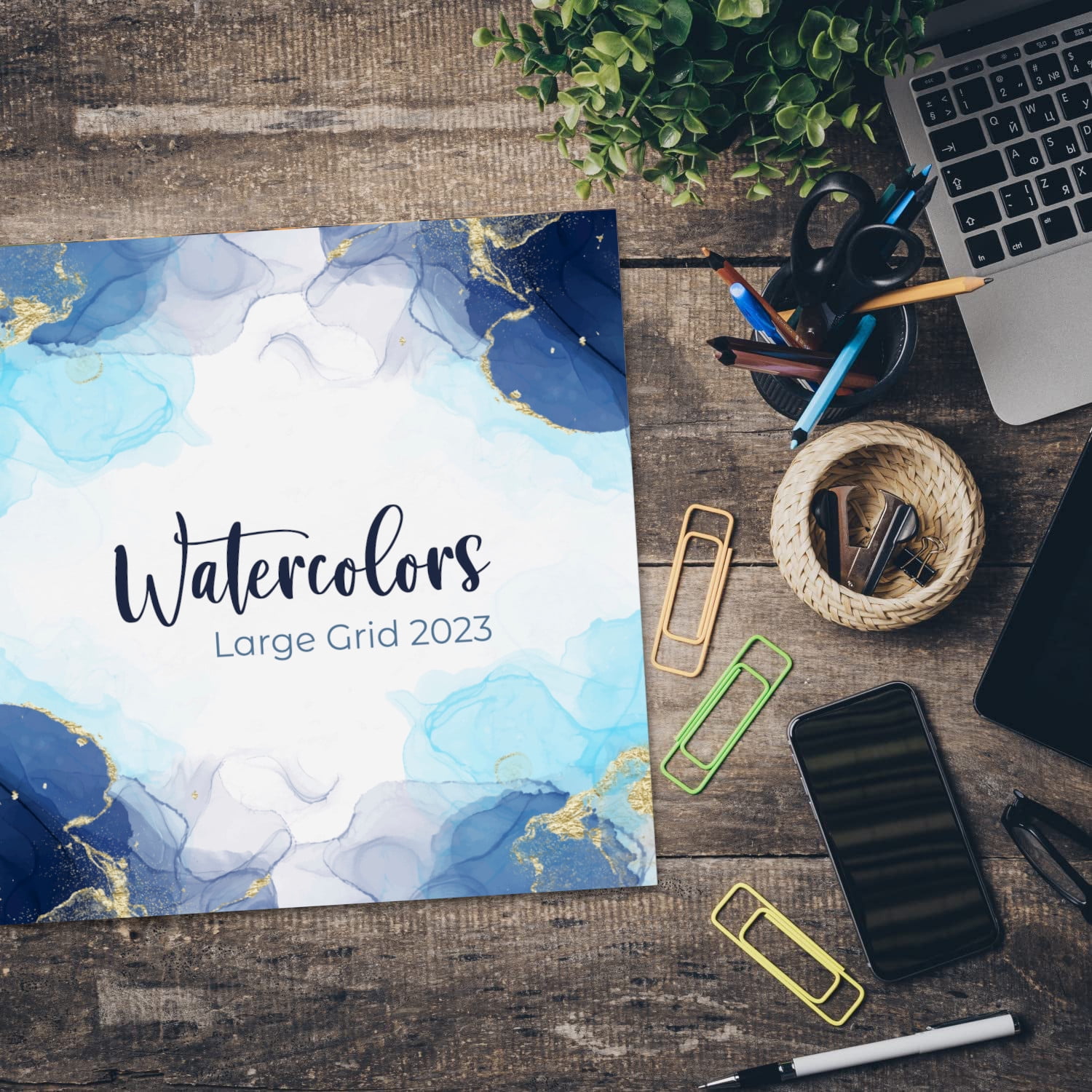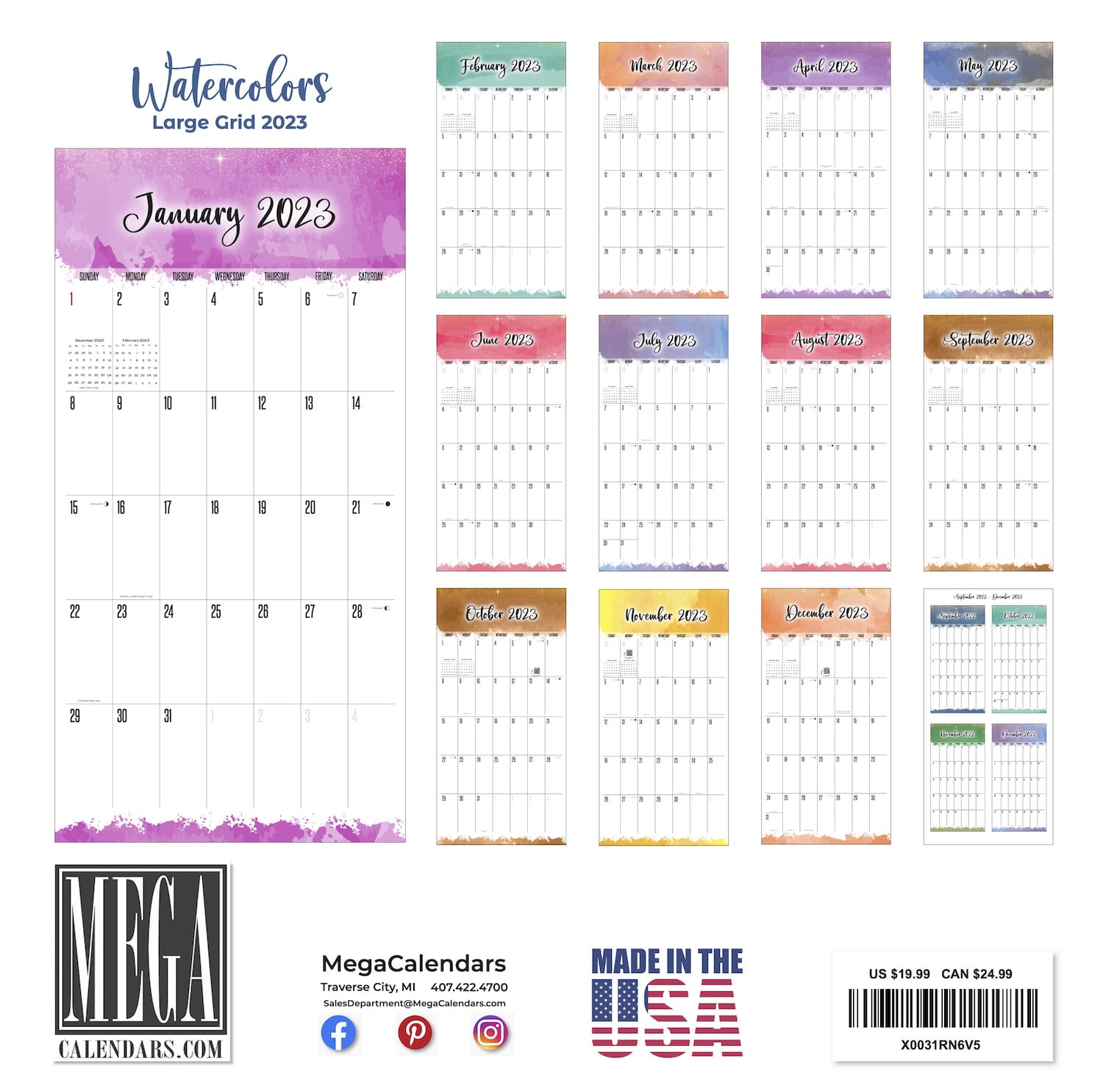 - Made in the USA! – The original Watercolors Large Grid MEGA calendar! MADE IN THE USA WITH PROFESSIONAL CONTENT DESIGN AND PHOTOGRAPHY – Featuring the best Watercolors Large Grid graphic artists and photographers on the planet. Each of the monthly pages contains past and future referencing dates to plan and track your monthly goals + Bonus months calendar for your long-term strategy and planning.
