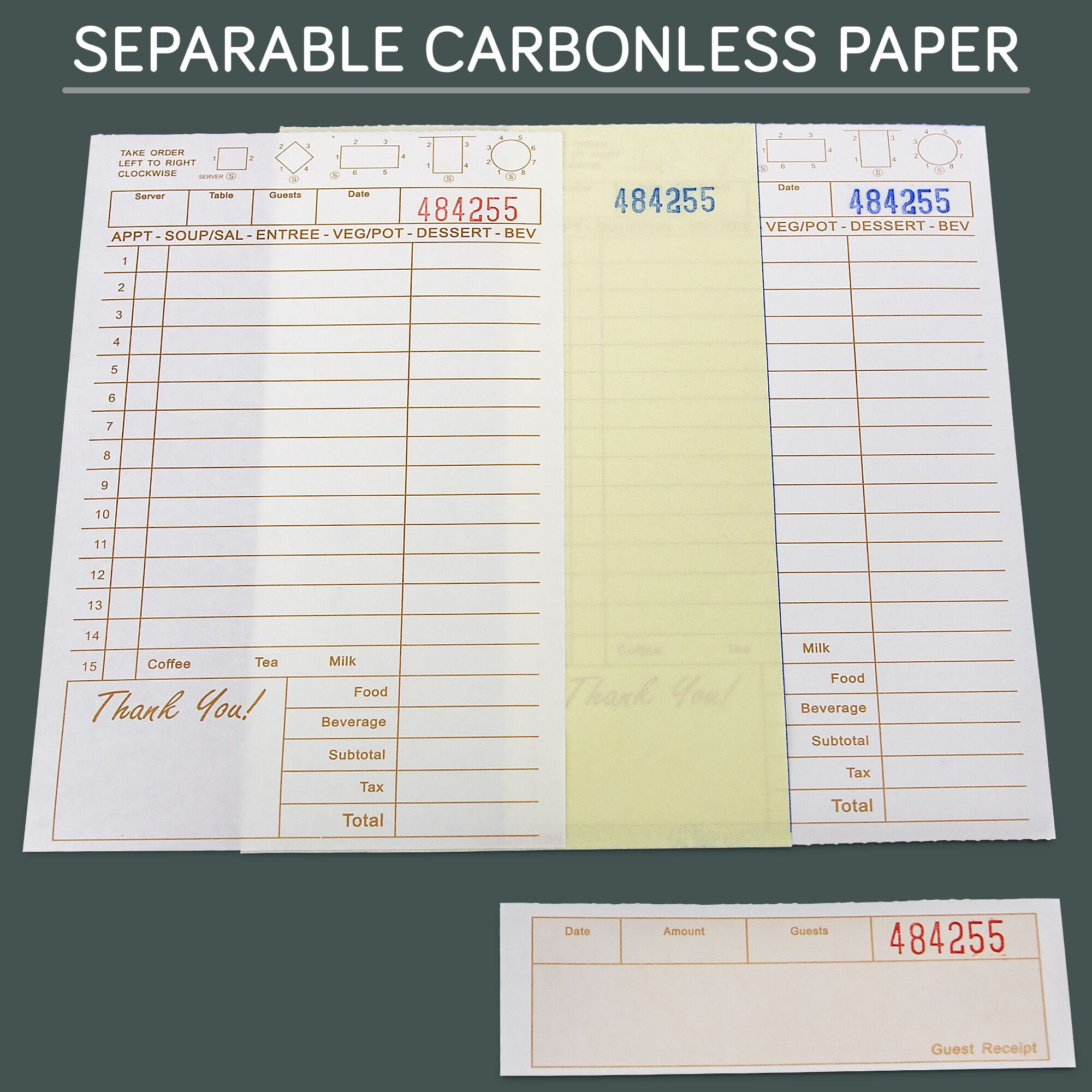 - EXCELLENT DESIGN: 3-part carbonless guest checks use triplicate paper to produce three records for a transaction. No carbon is needed for duplication and checks are perforated for ease of separation. Server pads are designed color-coded that enhance visual management in organizing your business file.