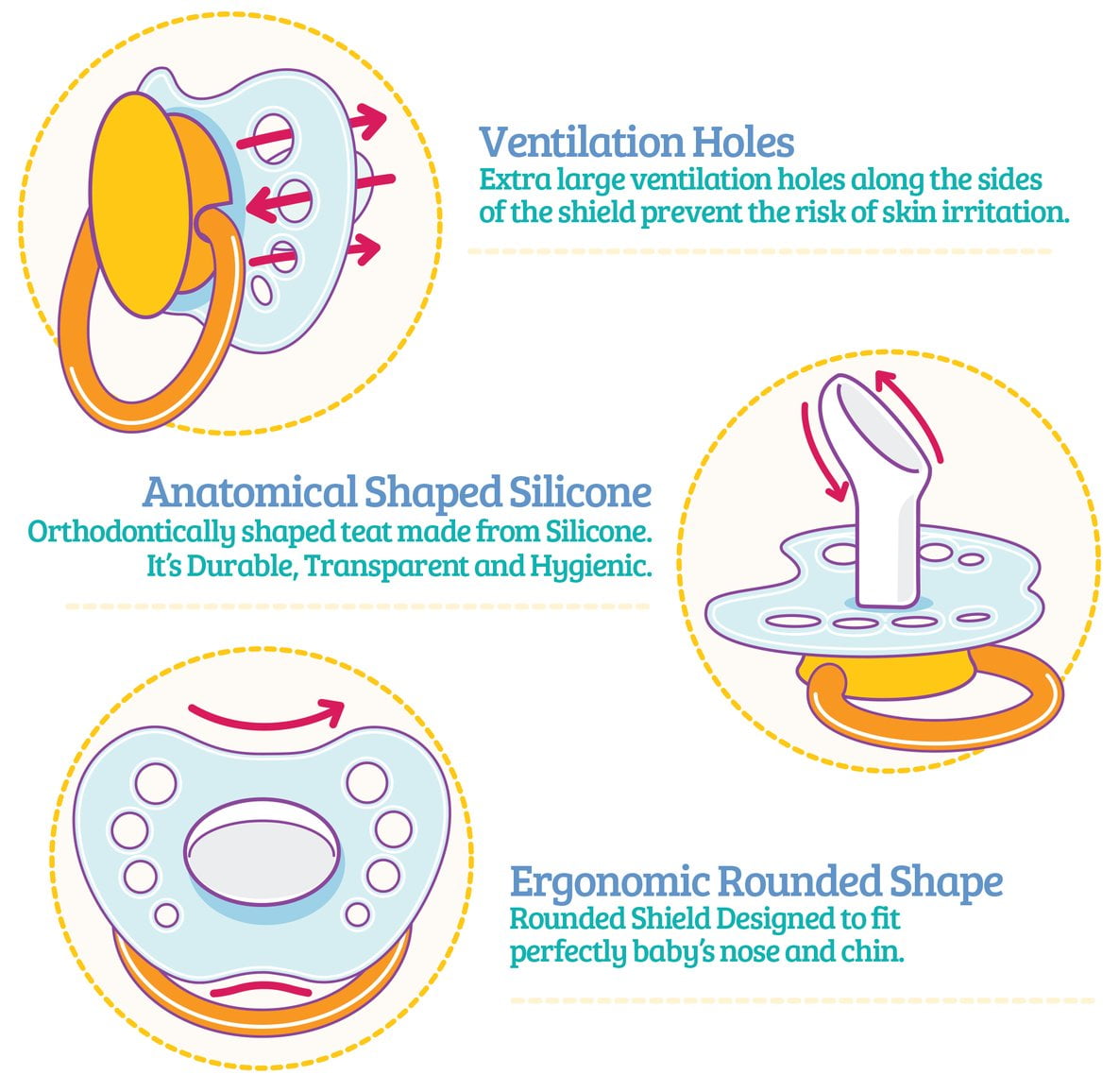 - Never attach ribbons or cords to pacifier, as your child may be strangled by them. Inspect carefully before each use, especially when the child has teeth. Check nipple strength by pulling in all directions. Discard at first when it comes the sign of damage or weakness. Do not leave baby unattended while using a pacifier. Keep the nipple protection cap away from children to avoid suffocation.