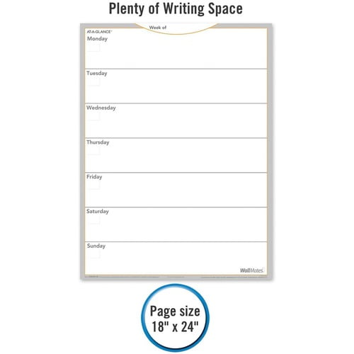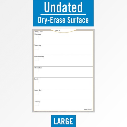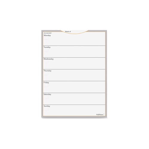 Turn your office walls, doors and other spaces into a dry-erase planning and note-taking center, instantly. This dry-erase planning surface offers a one-week, undated grid to customize your planning. Large, unruled daily blocks provide plenty of space that can be used for a variety of purposes. The weekly format also includes Monday-through-Sunday scheduling and a place at the top to write the date range of the week. This erasable planning surface is easy to use and goes up in seconds. Simply peel and stick the self-adhesive backing on any hard flat surface. Setup requires no tools or hardware and causes no damage to wall surfaces. Remove with no adhesive residue. WallMates Dry-erase Weekly Planning surface includes a self-adhesive, three-year reference calendar and dry-erase marker.