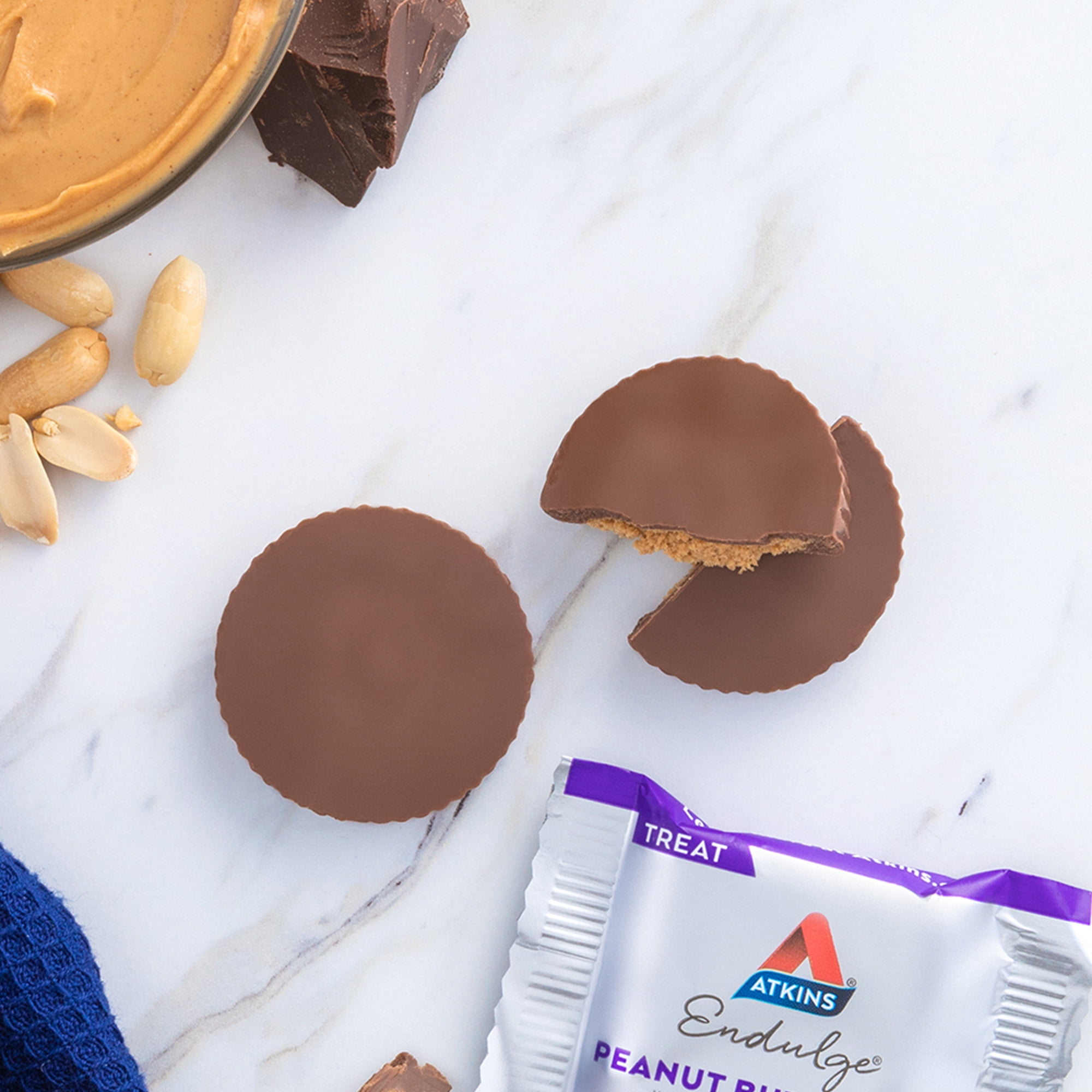 - PEANUT BUTTER CUPS. Enjoy creamy peanut butter in an indulgent chocolatey coating. The Atkins Peanut Butter Cups delight your taste buds while keeping you true to your lifestyle. 20 count.