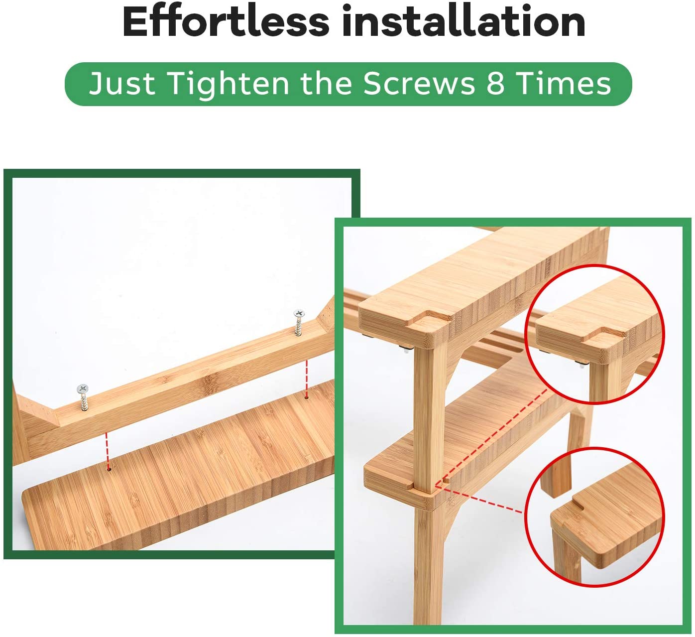 Easy to Assemble & Use: Can be easily assembled even without instruction. Only need to twist 4 screws( connect the panel and legs) for the first tier, then repeat again for the second tier, you will get a 2-tier High Capacity Spice Rack!