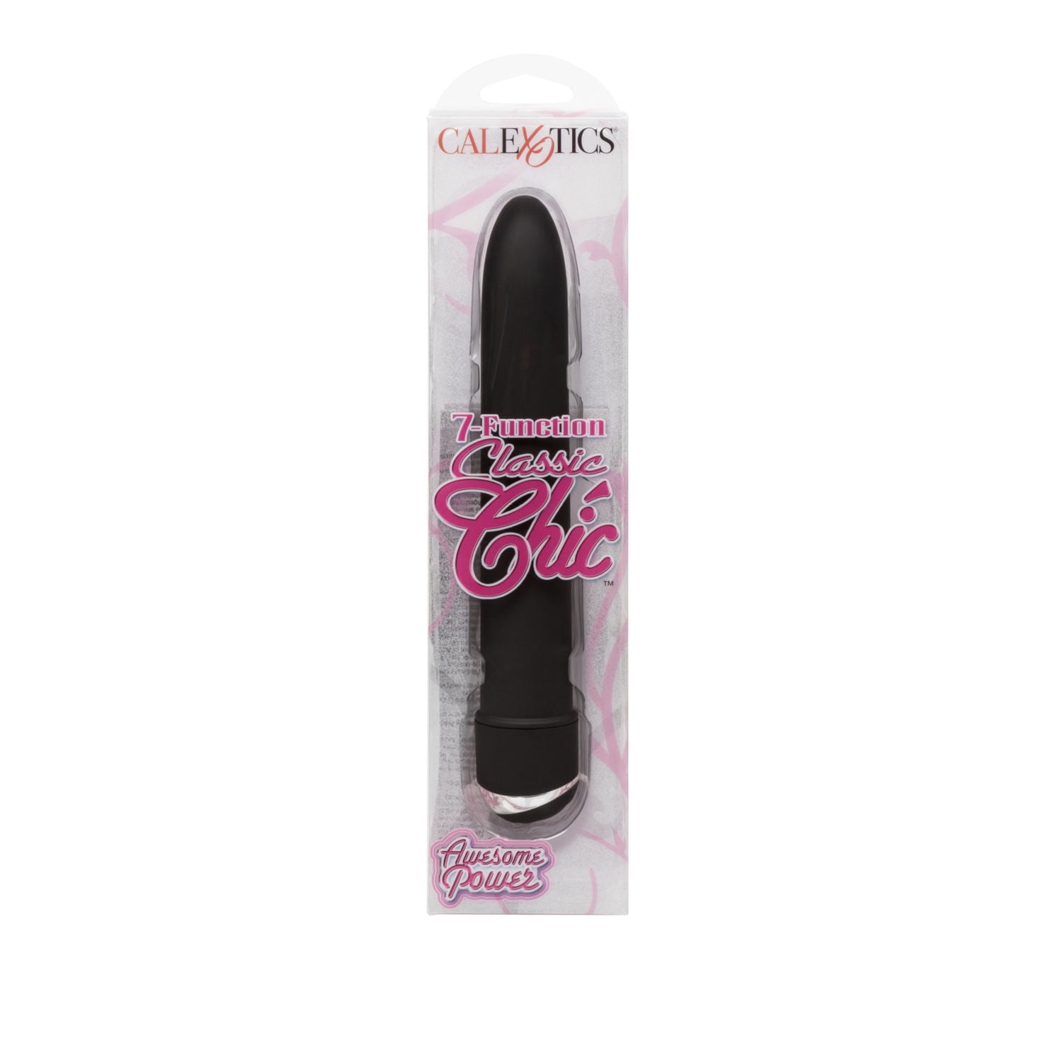 7 Function Classic Chic 6" Black Vibrator. Awesome power! Velvety soft and silky smooth massagers with an easy and discreet push-button operation. 7 powerful functions of vibration pulsation and escalation. Waterproof for play outside the bedroom. The vibrator measures 6 inches long by 1 inch wide. Do not leave batteries in the vibrator between uses. Safe and pure for body and pleasure. Made using phthalate free non-toxic materials ABS plastic with smooth and seamless Velvet Polyurethane PU Cote. Always clean before and after use plus between partners. A water-based lubricant is recommended. Category: For Women Vibrator Vibrators Top Selling Sex Toys. 7 Function Classic Chic Vibe is a registered trademark for California Exotic Novelties. Sex toys and sexual wellness.