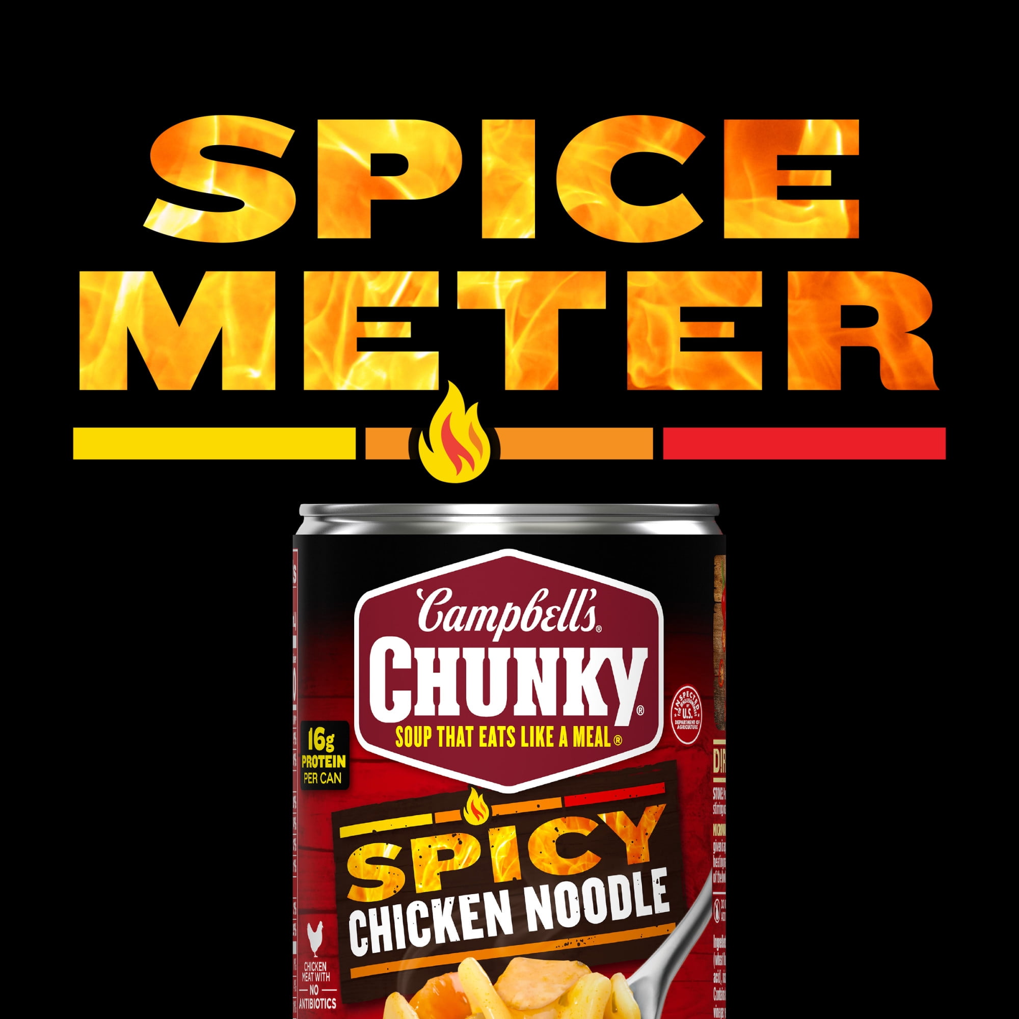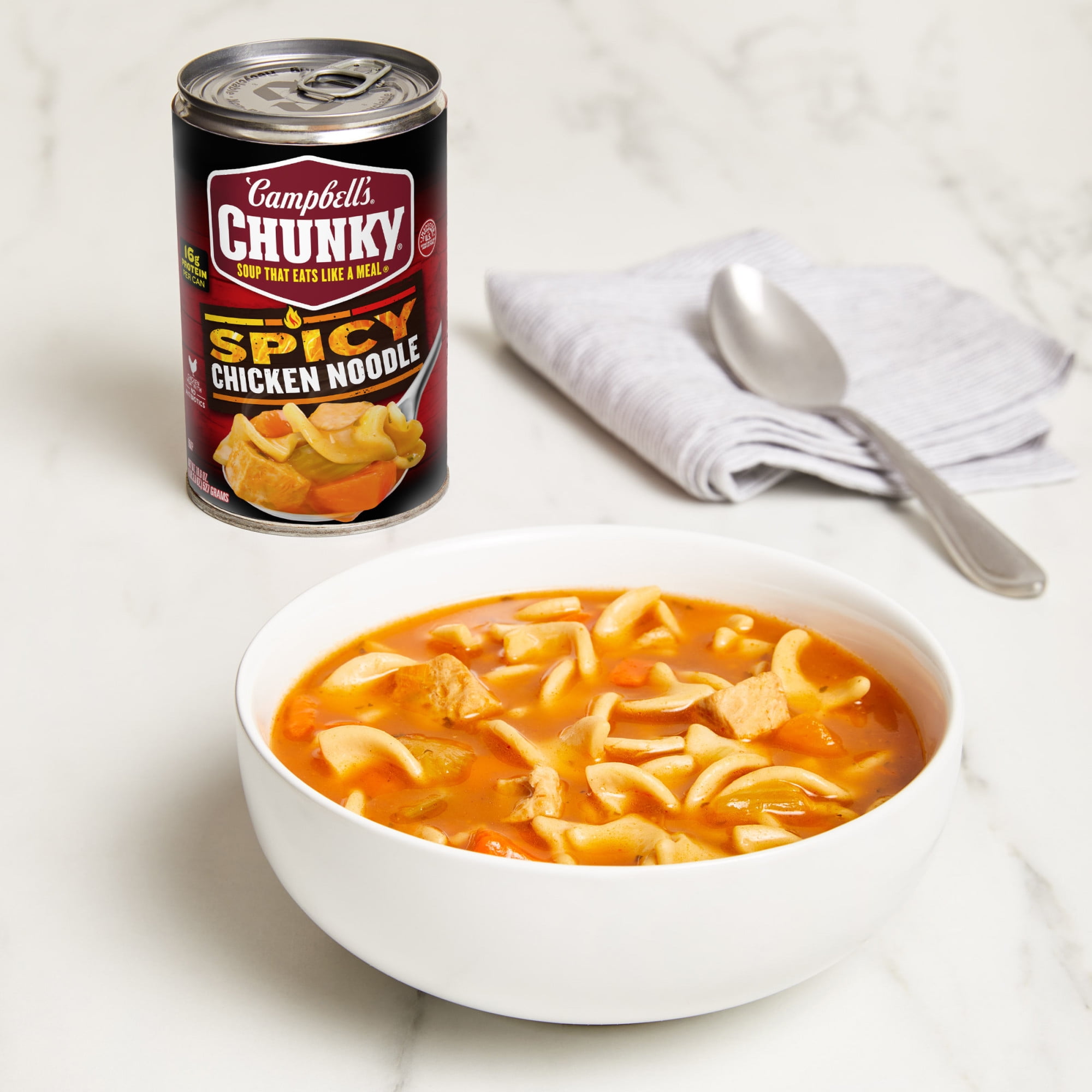 Campbell’s Chunky Spicy Chicken Noodle Soup isn’t just tasty-it’s made to spice up your life. With mouth-watering spicy flavors and bold ingredients, this spicy take on a comfort food classic is capable of fueling even the heartiest appetite. This ready-to-eat chicken soup is crafted with big pieces of chicken meat without antibiotics, chunks of carrots and celery, enriched egg noodles and a sizzling broth seasoned with chili pepper (1) and paprika. Each can has 16 grams of protein. It Fills You Up Right. Just pop this ready to eat soup in a microwave-safe bowl, heat and enjoy. Or, warm it over the campfire on your outdoor adventures. Whether you’re looking for quick and easy microwave soups for home or something to take on the go, Campbell’s has you covered. The soup can is recyclable for easy disposal. Take on the great outdoors with Campbell’s Chunky Spicy Chicken Noodle Soup-Soup That Eats Like a Meal.In addition to Spicy Chicken Noodle Soup, Campbell’s Chunky Soup is also available in New England Clam Chowder, Sirloin Burger and more.(1) extract