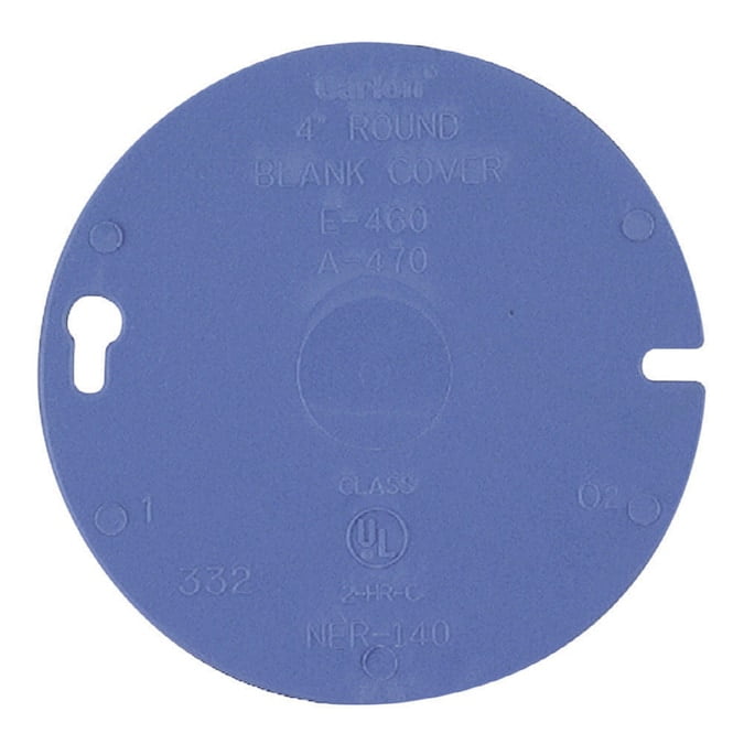 The round blank box cover is designed to cover 4 in. round switch or outlet boxes. Made of durable PVC which is non-corrosive and non-conductive. For indoor use. UL listed. Use to cover a round ceiling or wall box 4 inch diameter Cover is blank Durable PVC constructionCARLON Round Plastic Electrical Box Cover
