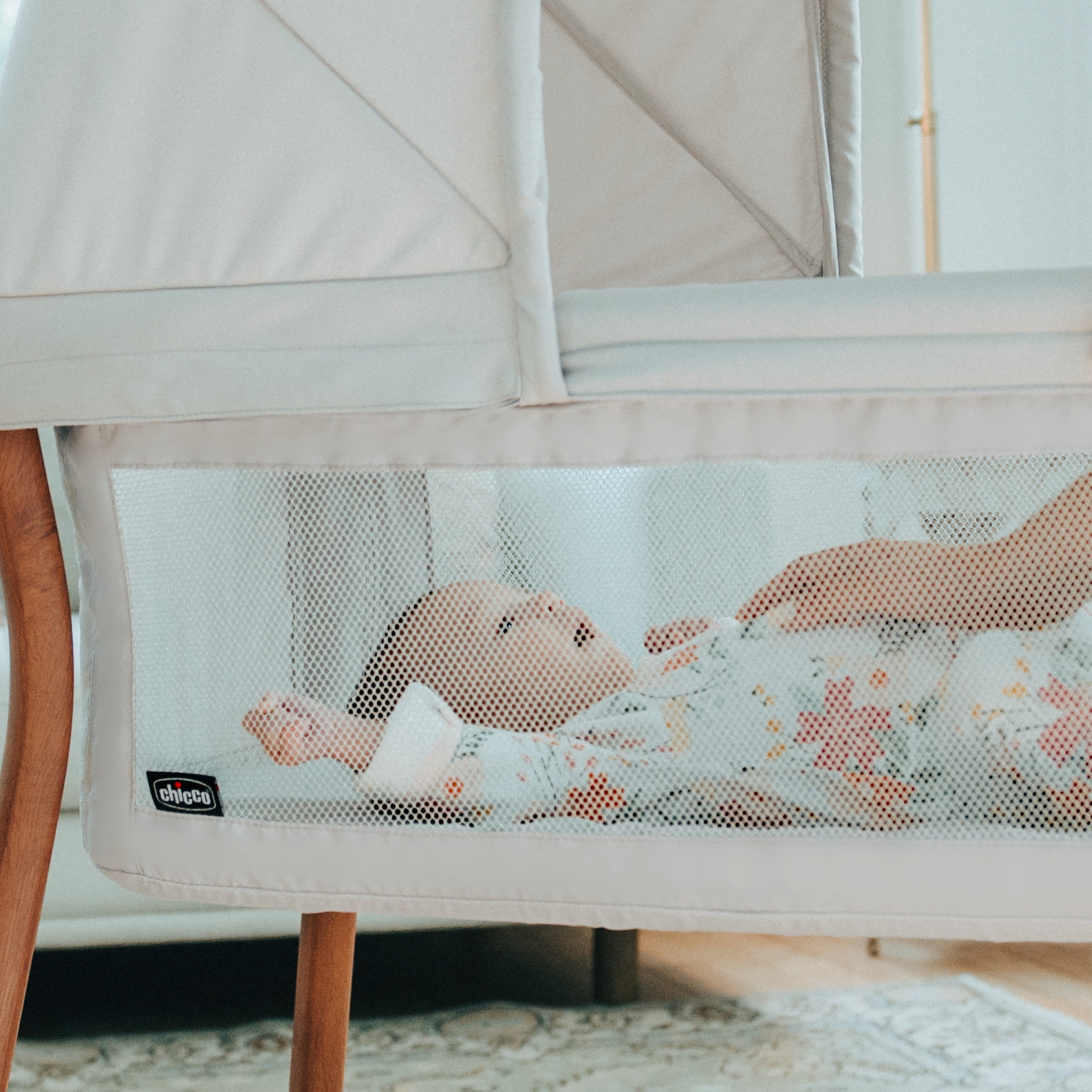 The portable bassinet folds flat and fits inside the included carry bag for effortless travel and storage.