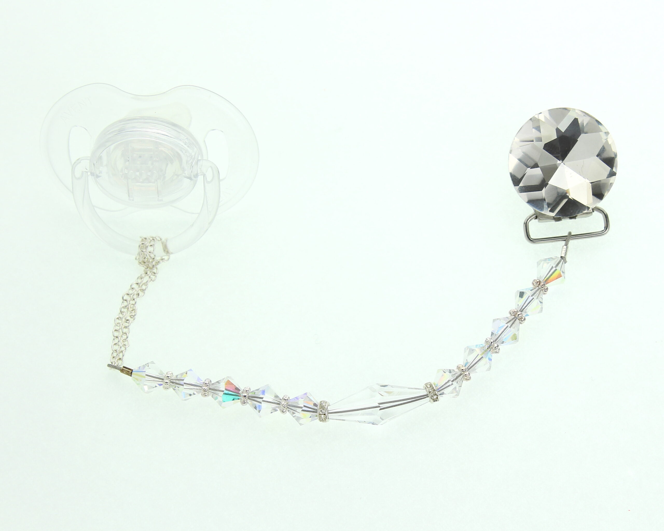 Clear Diamond Crystal Pacifier Clip with Crystals and Long Crystal CenterClear Diamond Crystal Pacifier Clip with Crystals and Long Crystal Center This pacifier clip is what I call deluxe !. Made with only custom made especially for me swarovski-crystal rhinestones button, swarovski crystal bicones, and pave disco ball beads t