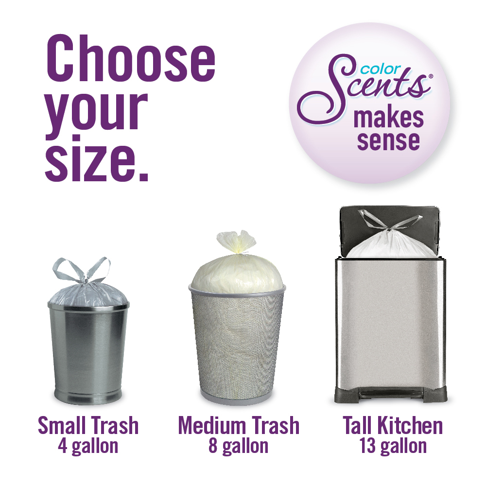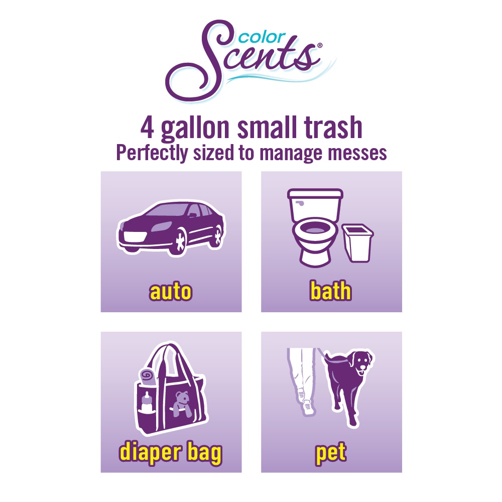 Style linen fresh scent size 200 Ct. pack of 1 Color Scents trash bags offer strength style savings in every bag Color Scents 4 Gallon Small Trash Bags are perfectly sized to help manage messes in your bedroom bathroom car or on the go With a convenient drawstring closure simply cinch and carry knowing your trash is effortlessly contained Add in a subtle burst of Linen Fresh fragrance to keep your room or car smelling clean and fresh Whether you need a reliable trash bag in the house or in the car you can depend on Color Scents 4 gallon 200 count Linen Fresh Drawstring trash bags to be your small mess solution Color Scents makes sense.