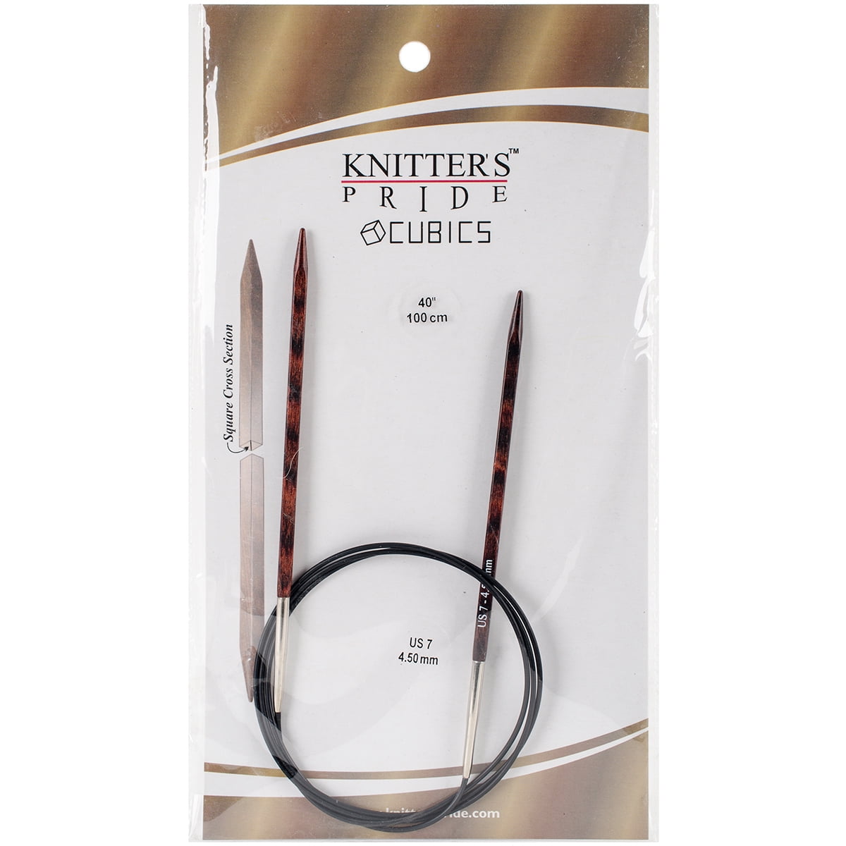 Knitter’s Pride-Cubics Fixed Circular Needles. The cuboid shape gives way to the perfectly tapered birch wood needle points. Cubics needles are elegant laminated Symfonie Rose wood that is rich in appearance, yet lightweight, strong and flexible. The unique ergonomic shape provides comfort to the hand and uniform stitch formation. Perfect for socks and beginners with easy grip and control over your knitting. Cords are flexible and lay flat with no kink or twist as well as easy to store. This package contains one pair of circular needles with a 40 inch cord. Comes in a variety of sizes. Each sold separately. Imported.Cubics Fixed Circular Needles 40"-Size 7/4.5mm