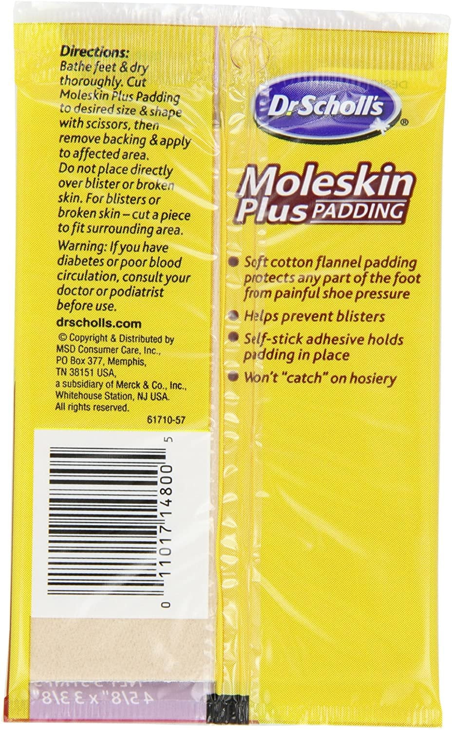 Dr. Scholls Moleskin Plus 4 1/8-Inch X 3 3/8 Inch Padding 3 EachSoft cotton flannel padding can be cut to any size for all-day relief of painful corns, calluses and tender spots. Known worldwide for its effective cushioning properties, Moleskin Plus is soft, cotton flannel padding that protects feet from painful shoe friction. Helps prevent blisters.