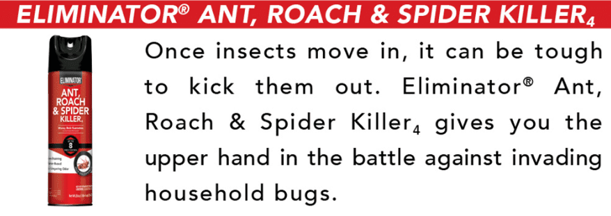 - KILLS ON CONTACT: Eliminator Ant, Roach & Spider Killer4 kills cockroaches, ants, carpenter ants, crickets, firebrats, fleas, silverfish and spiders