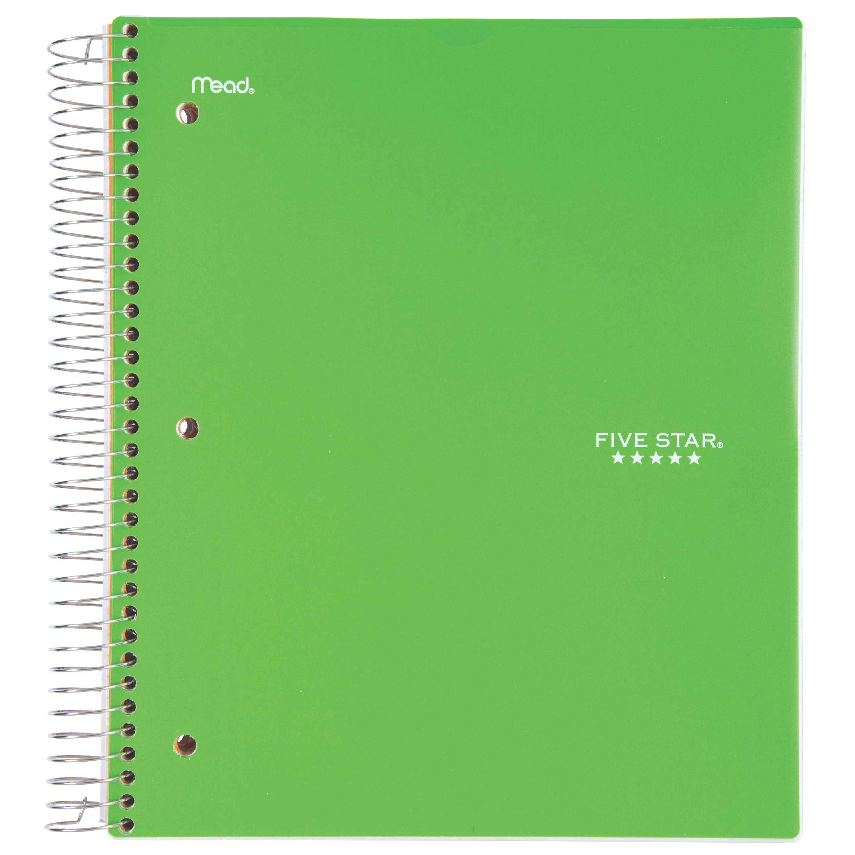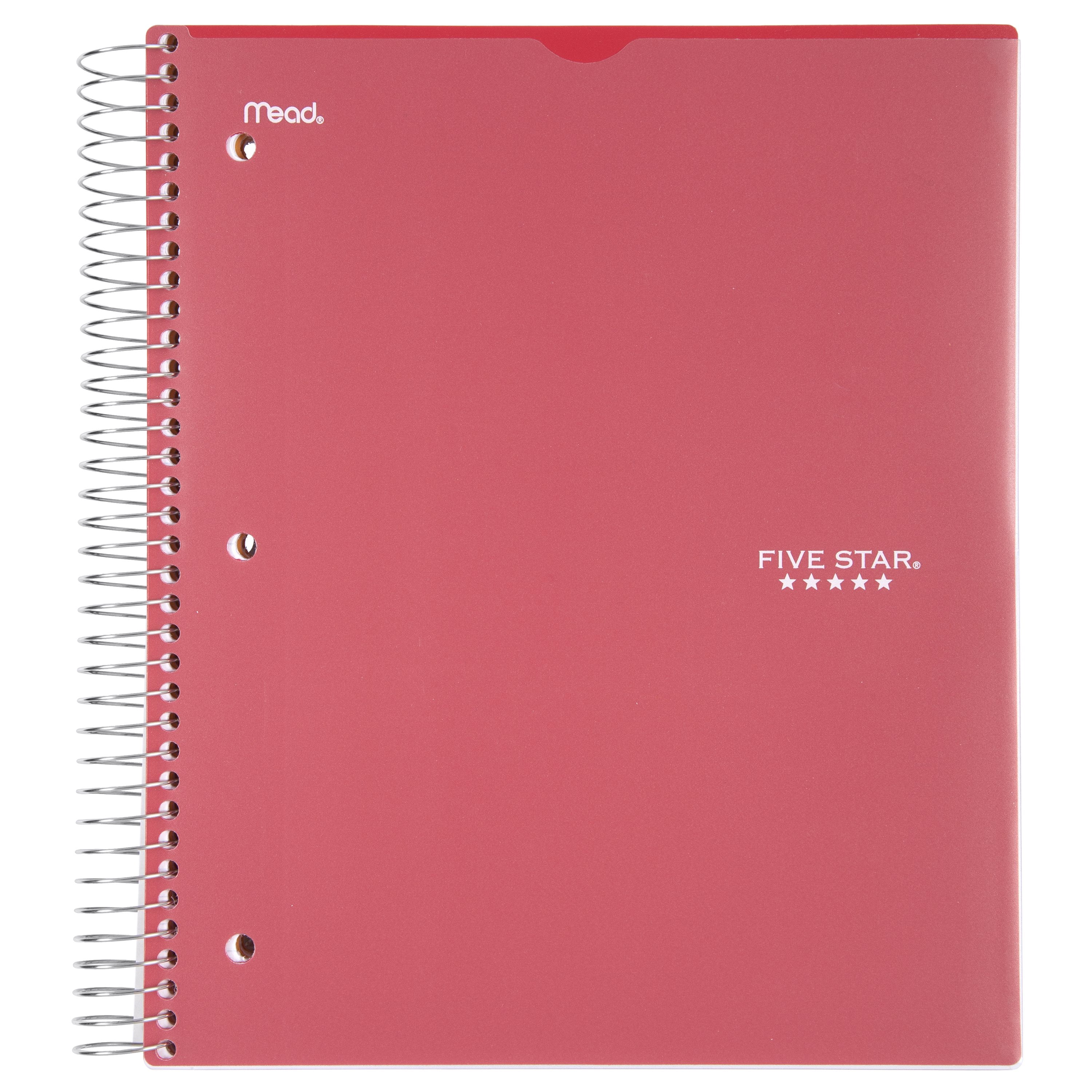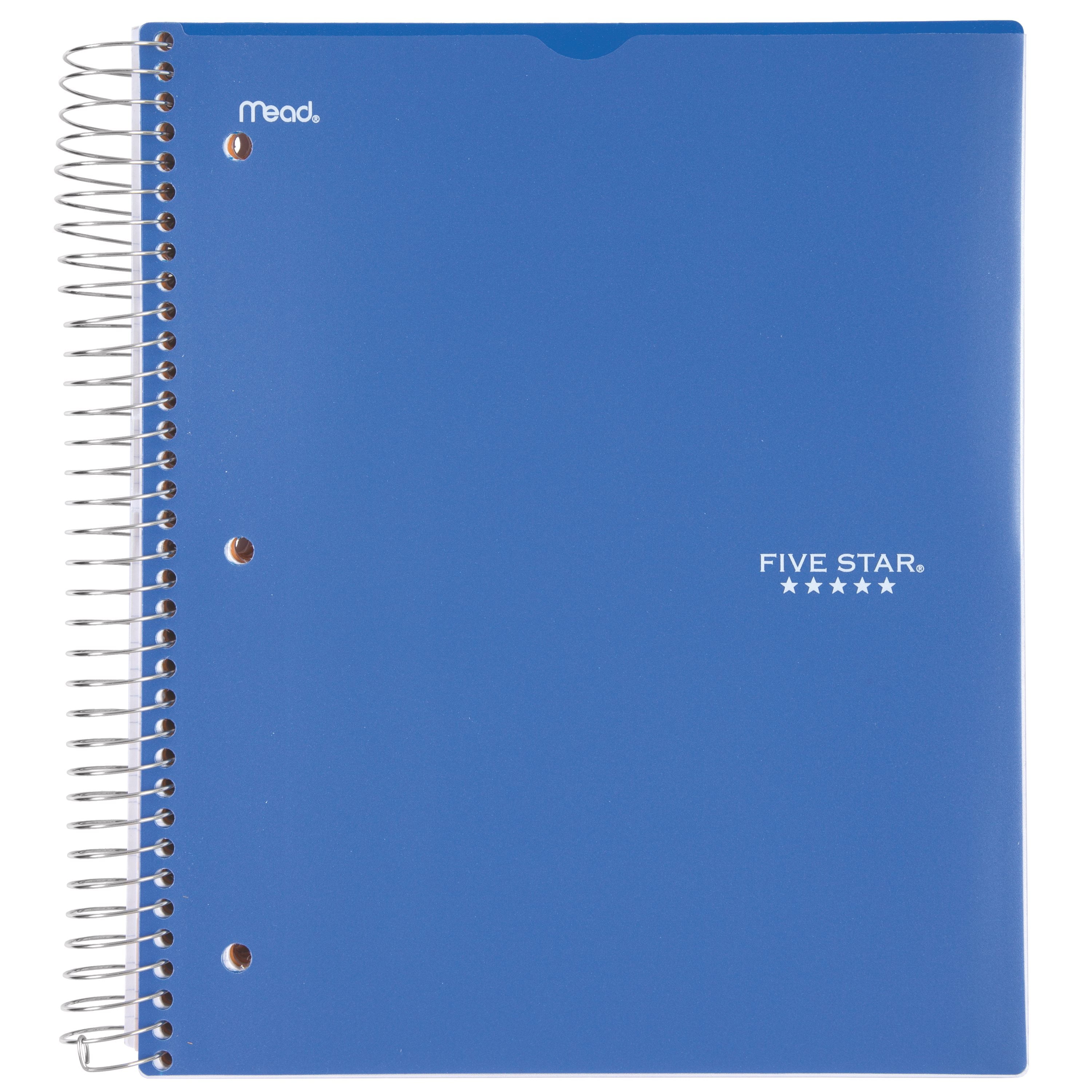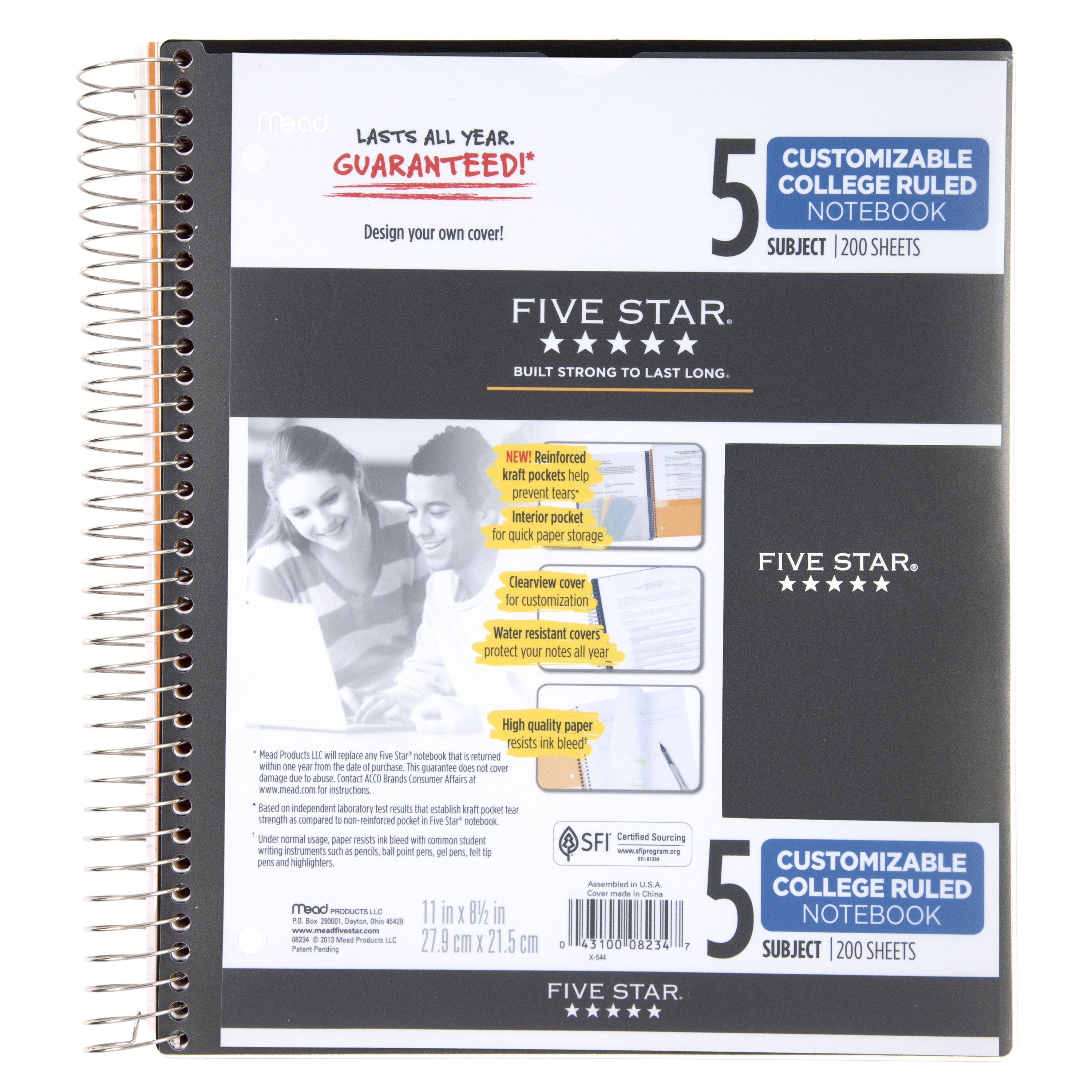 LASTS ALL YEAR. GUARANTEED!* This Five Star Wirebound Notebook has 200 sheets of high-quality paper that resist ink bleed.** The pockets are perfect for holding loose sheets of paper. The clearview plastic cover can be personalized by inserting a photo or drawing. Durable, water-resistant cover protects notes. College ruled 5 subject notebook is perfect for any class or project. The notebook is 3-hole punched to allow use with a binder and features Spiral Lock wire to prevent coil from snagging on your cloths or backpack and Neat Sheet perforated pages for easy tear out. *ACCO Brands will replace any Five Star notebook that is returned within one year from the date of purchase. This guarantee does not cover damage due to abuse. Contact ACCO Brands Consumer Affairs for instructions. **Under normal usage, paper resists ink bleed with common student writing instruments such as pencils, ball point pens, gel pens, felt tip pens and highlighters.