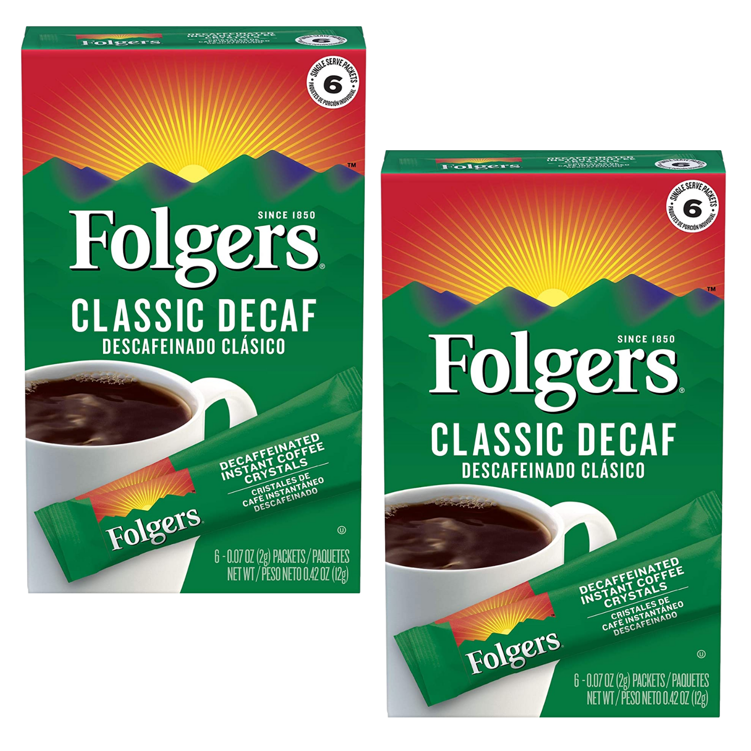 Folgers Classic Decaf Decaffeinated Instant Coffee Crystals, 6 Single Serve Packets (2 Boxes Total of 12 Sachet) Made with 100% Pure Coffee Medium Roast Convenient & On the Go Coffee Powder