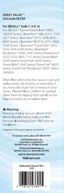 Great Value BISSELL Style 7, 9, & 16 Post-Motor Vacuum Filter, 2349 To maximize performance and extend the life of your vacuum, filters should be cleaned and replaced regularly. Clean filters after every few vacuum uses and replace every 3-6 months, or more often if you have a lot of pet hair or messes in your home. It is best to keep an extra filter on hand in case it is needed.Great Value BISSELL Style 7, 9, & 16 Post-Motor Vacuum Filter, 2349: