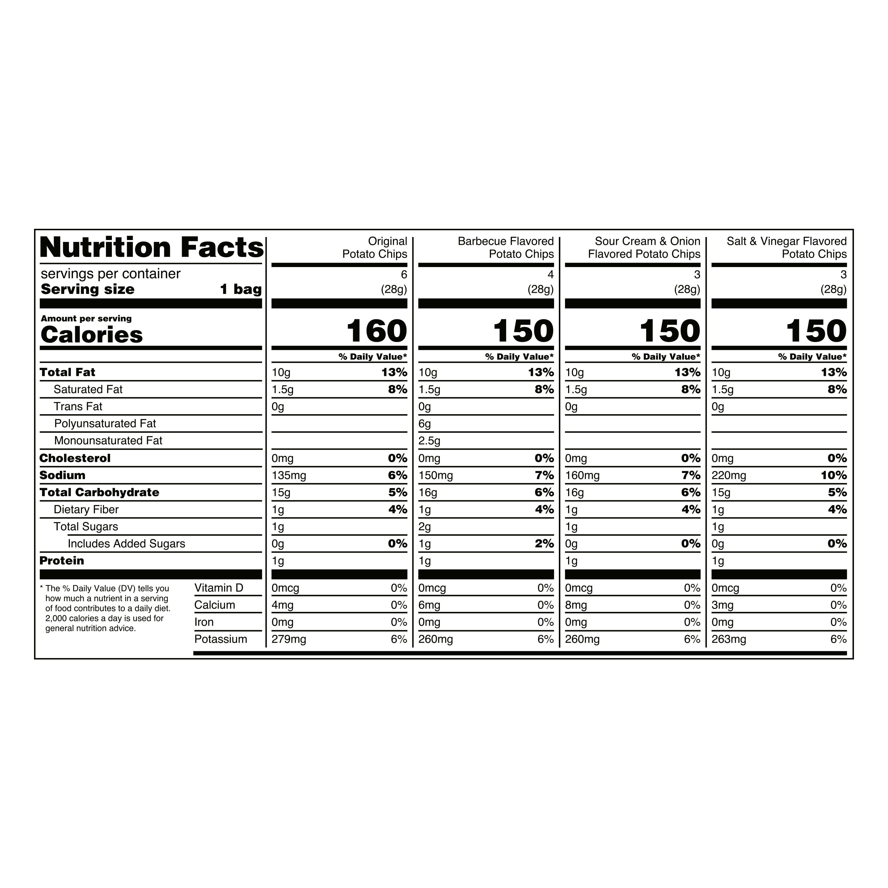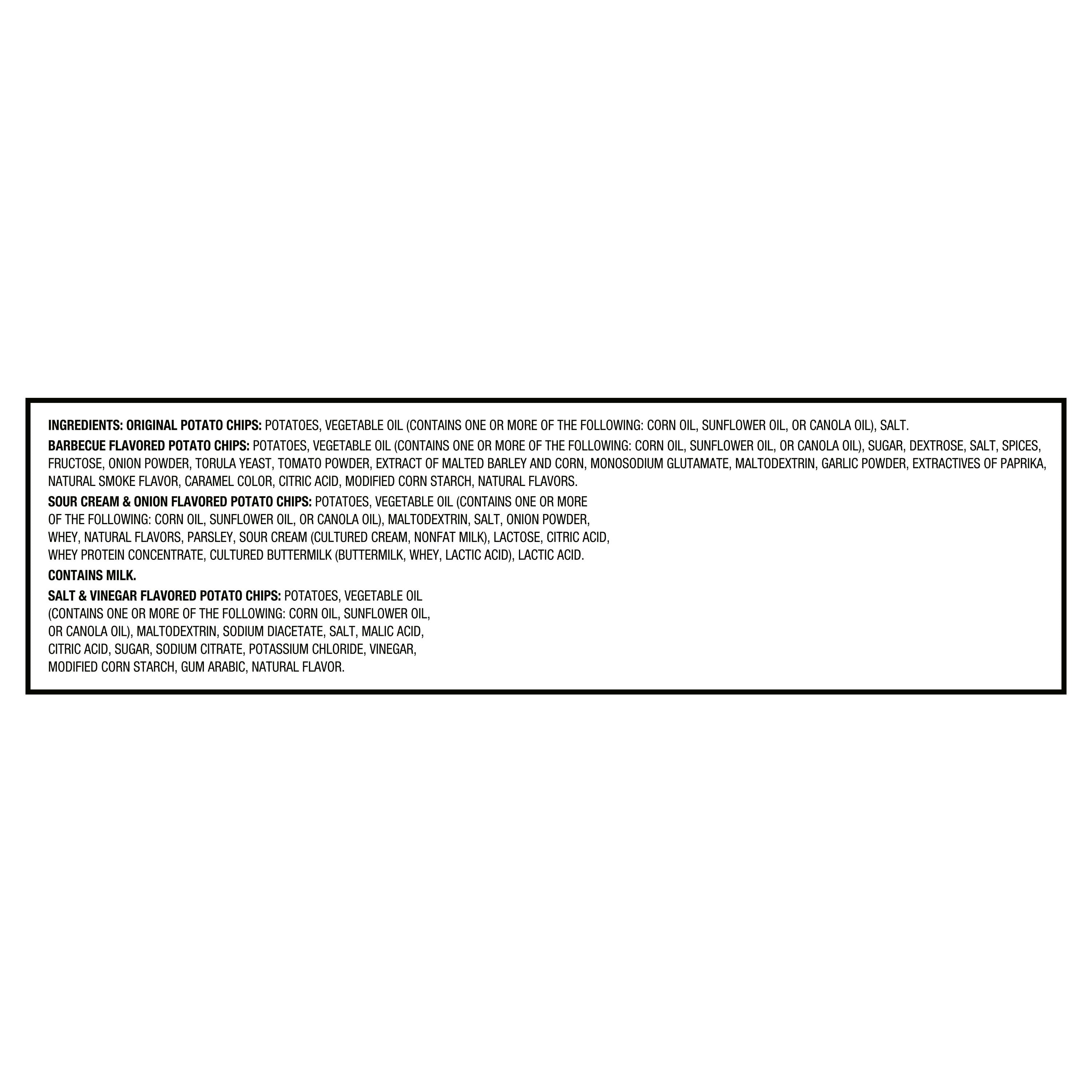 - 6 bags Original Potato Chips, 4 bags Barbecue Potato Chips, 3 bags Sour Cream and Onion, and 3 bags Salt and Vinegar Chips Potato Chips