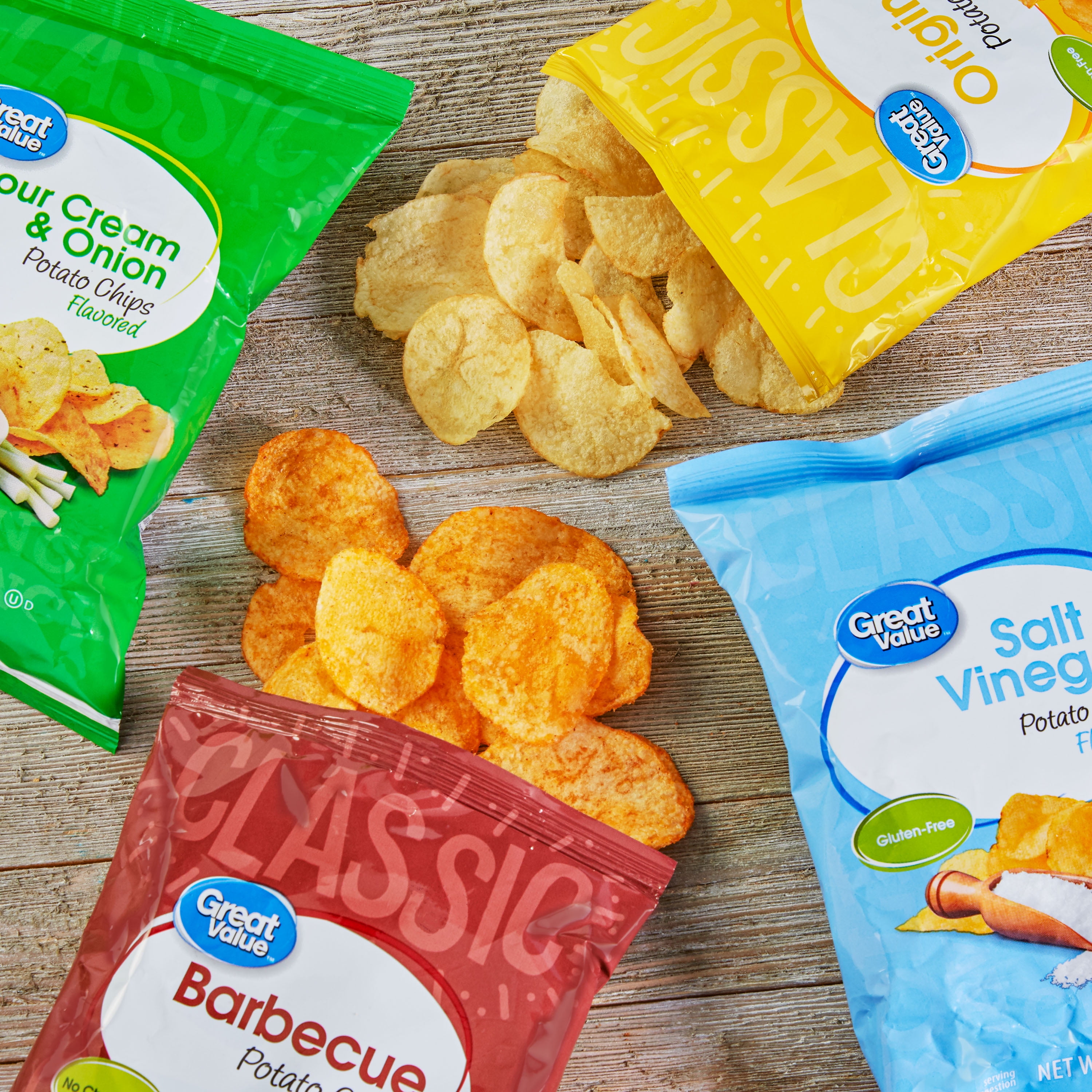 Make snack time a breeze with Great Value Classic Potato Chip Variety Pack. This variety pack contains an assortment of yummy chips including six bags of Original Potato Chips, four bags of Barbecue Potato Chips, three bags of Sour Cream and Onion Potato Chips, and three bags of Salt and Vinegar Potato Chips. With such a wide variety, this pack is sure to have something for everyone. They are ideal for school lunches, parties, road trips, family outings and other gatherings. Keep some at the office for a quick snack between meetings or take some to share with the whole office.