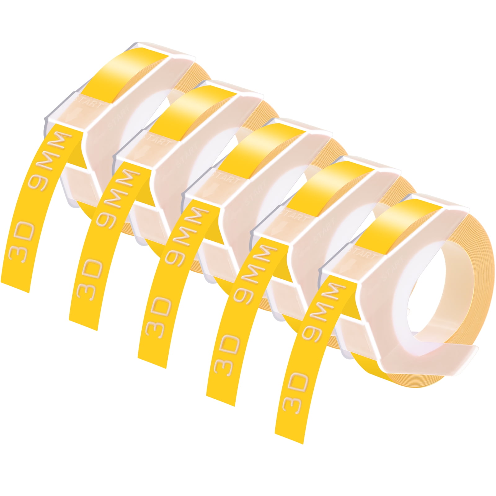 GREENCYCLE 5PK Compatible for Dymo 3D Plastic Embossing Labels 520108 White on Yellow Label Tape 9mm 3/8” x 3m 9.8′ Use in Organizer Xpress Pro 12966, Office Mate II 1540, Motex E101 Label Maker