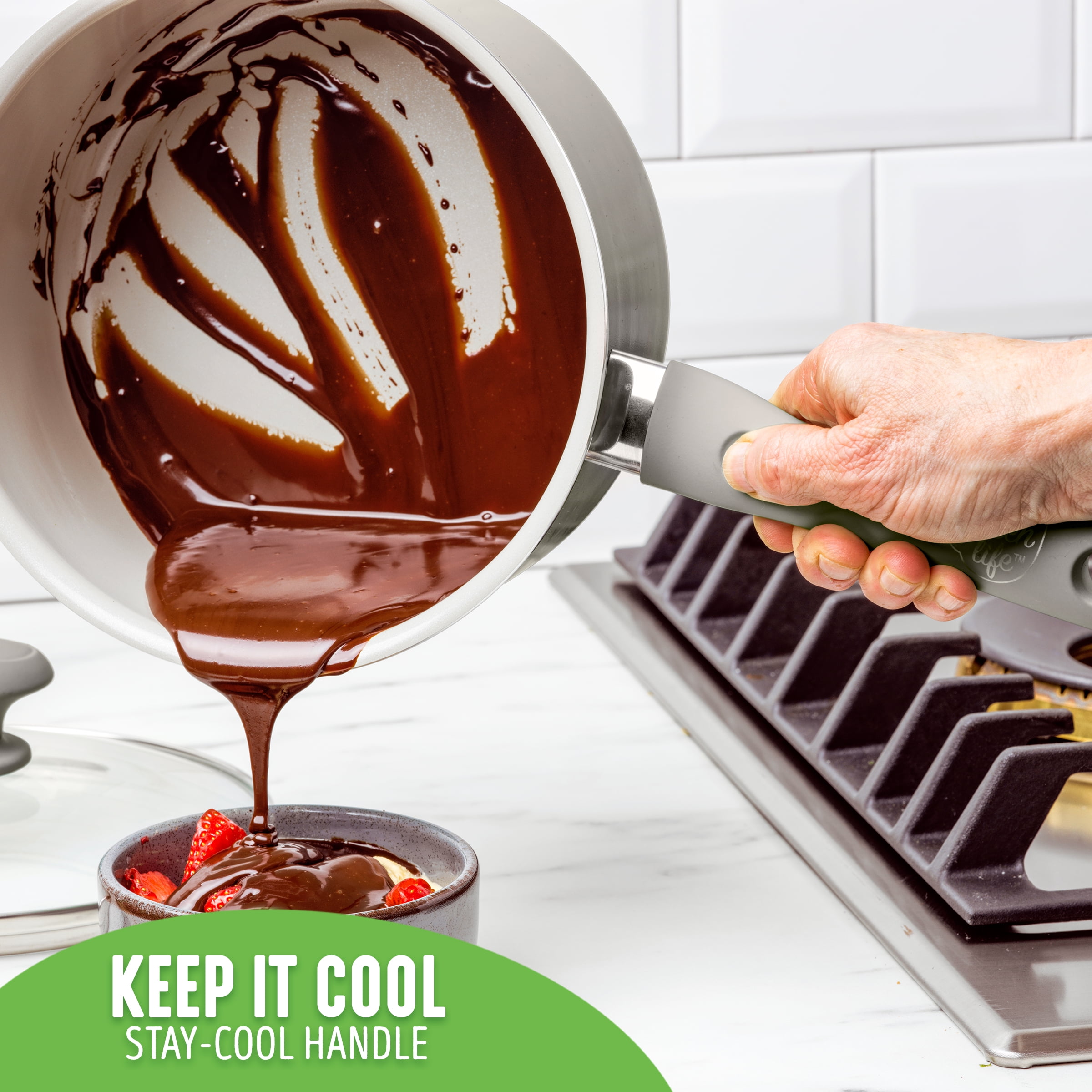 The Greenlife Savory Ceramic Nonstick Gray 2.5 Quart Sauce Pan helps you get a grip—literally! Stay-cool Bakelite handles offer extra comfort that makes everyday cooking easier than ever. Best of all, our healthy ceramic nonstick coating releases even the stickiest foods effortlessly and wipes clean in seconds, no soaking required.
