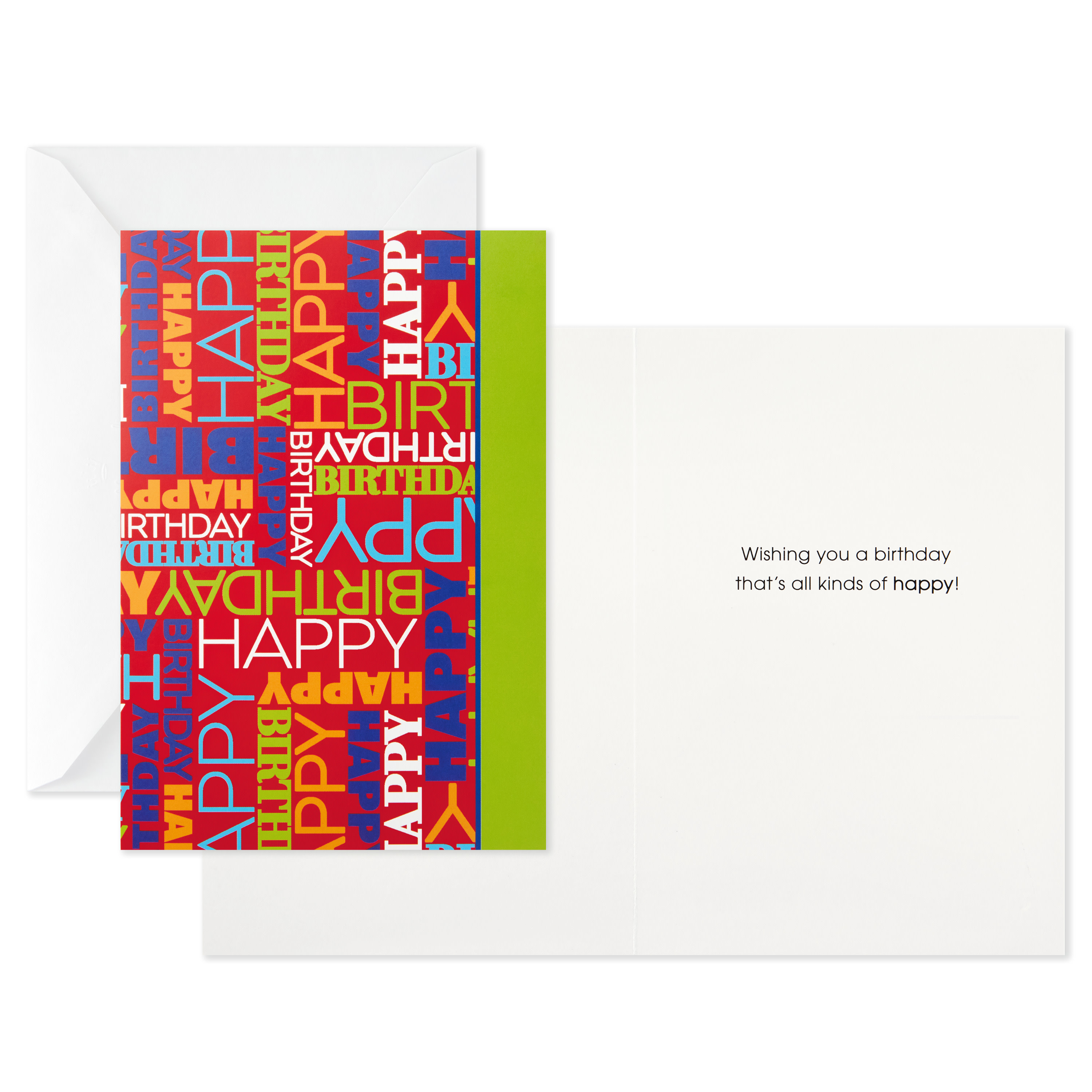 One box of birthday cards, four colorful designs and messages. Each of the 12 cards in this variety pack comes with a white envelope, keeping you well-stocked and ready to celebrate year round. Buy this card assortment with confidence; the Hallmark brand is widely recognized as the very best for greeting cards, gift wrap, and more.