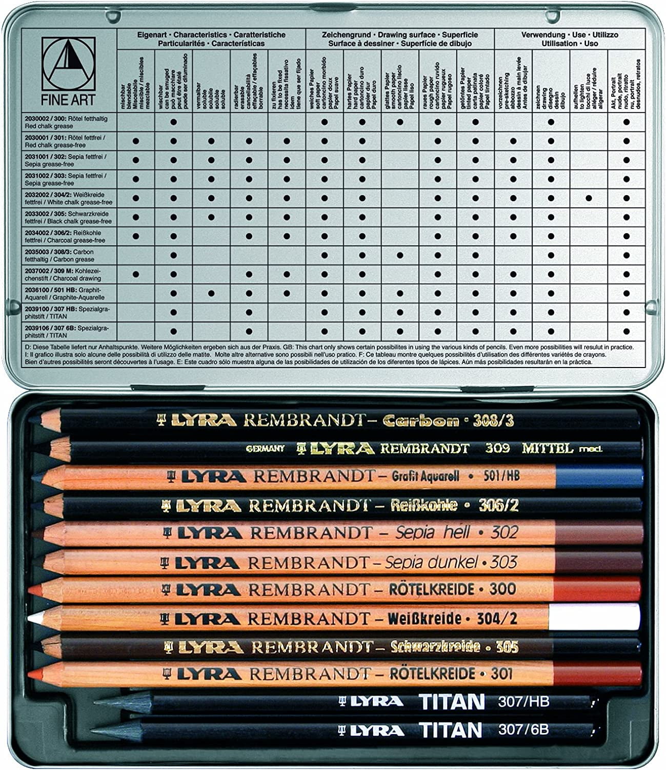 The Lyra Rembrandt aquarelle colored pencils are made with high-quality, lightfast pigments for high quality performance. These pencils write smoothly, and their leads can be dissolved almost completely with water. Create opaque colors or light washes, blend them for easy shading, all by simply adding water to the process. These pencils are suited for drawing, sketching, blending, and more. The Lyra Rembrandt Art Specials tin includes 12 unique drawing pencils designed for serious artists and aspiring students alike. The set includes two Titan woodless graphite drawing pencils (HB and 6B), one graphite aquarelle drawing pencil (HB), one charcoal drawing pencil, one carbon drawing pencil, one black chalk drawing pencil, one white chalk drawing pencil, two red chalk drawing pencils and two brown sepia drawing pencils. In short, everything you need to create your own masterpiece.