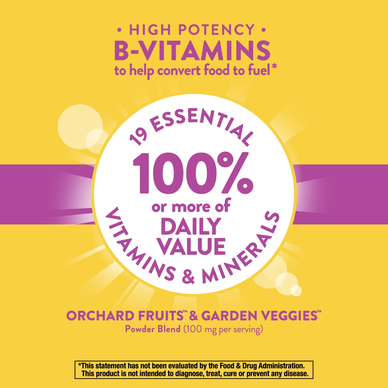 - Contains food-based Orchard Fruits & Garden Veggies powder blend (100 mg per serving).