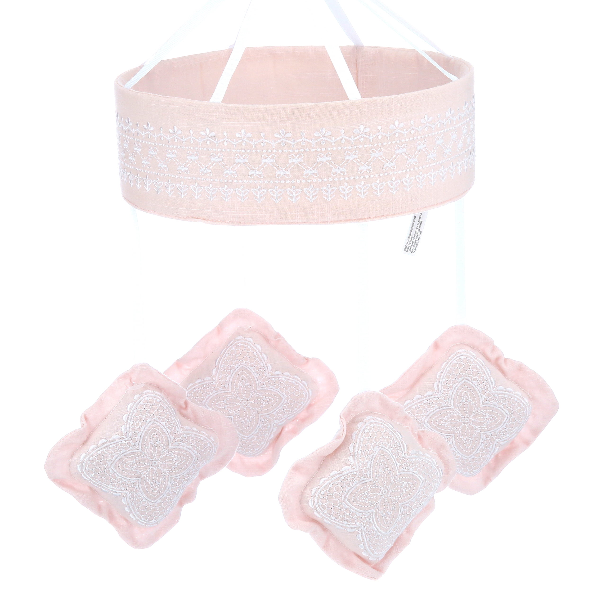 Chantilly lace is a delicate and dainty delight, French inspired with a linen and lace look. Featured in soft pink linen look fabrics accented with white lace embroidered details. Bring the look of Provance into your nursery with this elegant Infant bedding collection.NoJo Chantilly Musical Mobile – This musical mobile will help soothe your little one to sleep, gently spinning while playing Brahms’ Lullaby. Features adorable plush pink velboa shapes detailed with white lace embroidery, Includes plush pink fabric sleeves for mobile arms. Coordinates with a full line of NoJo Chantilly nursery bedding and décor.