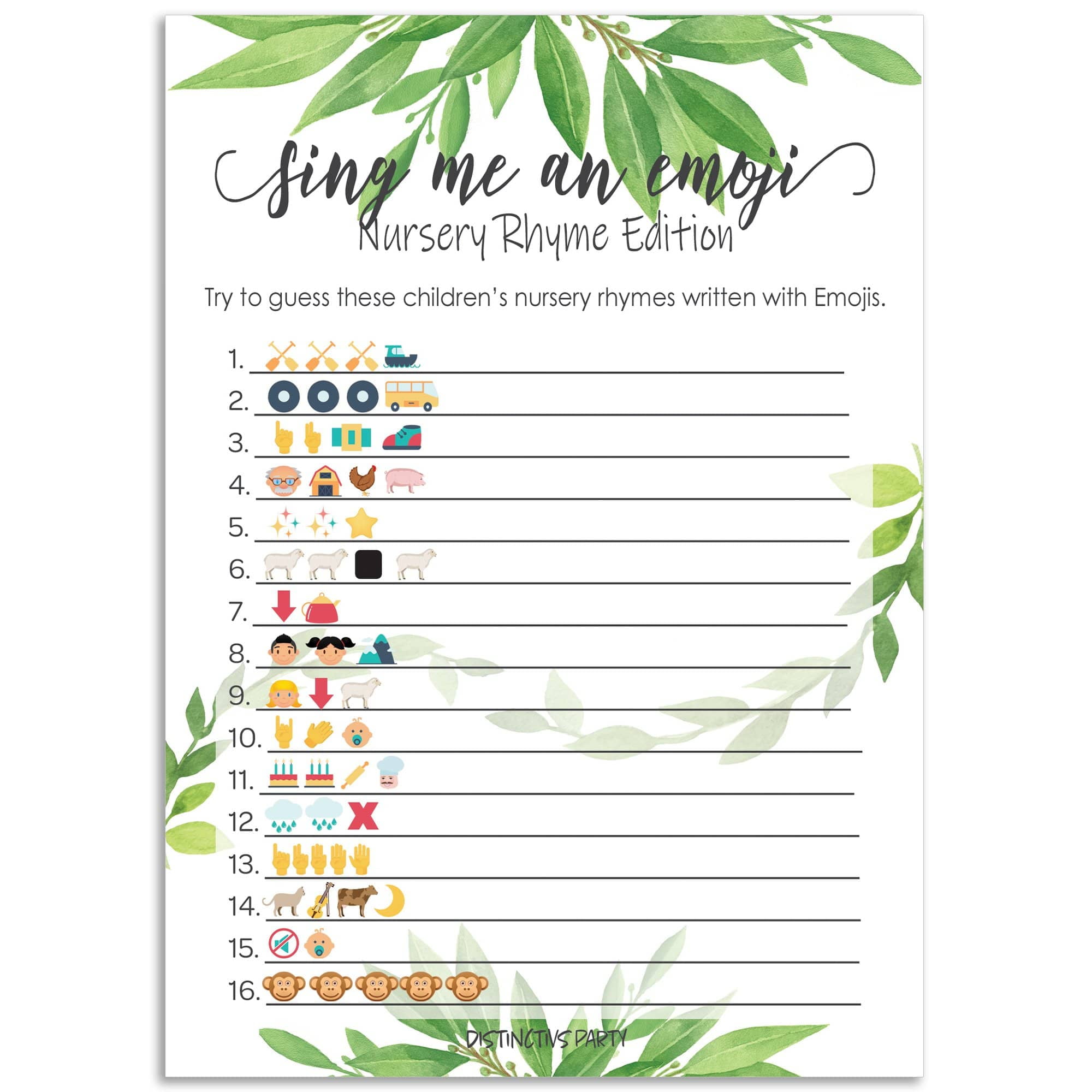 Nursery Rhyme Emoji Game Cards – Greenery Baby Shower Theme – 20 count – Distinctivs