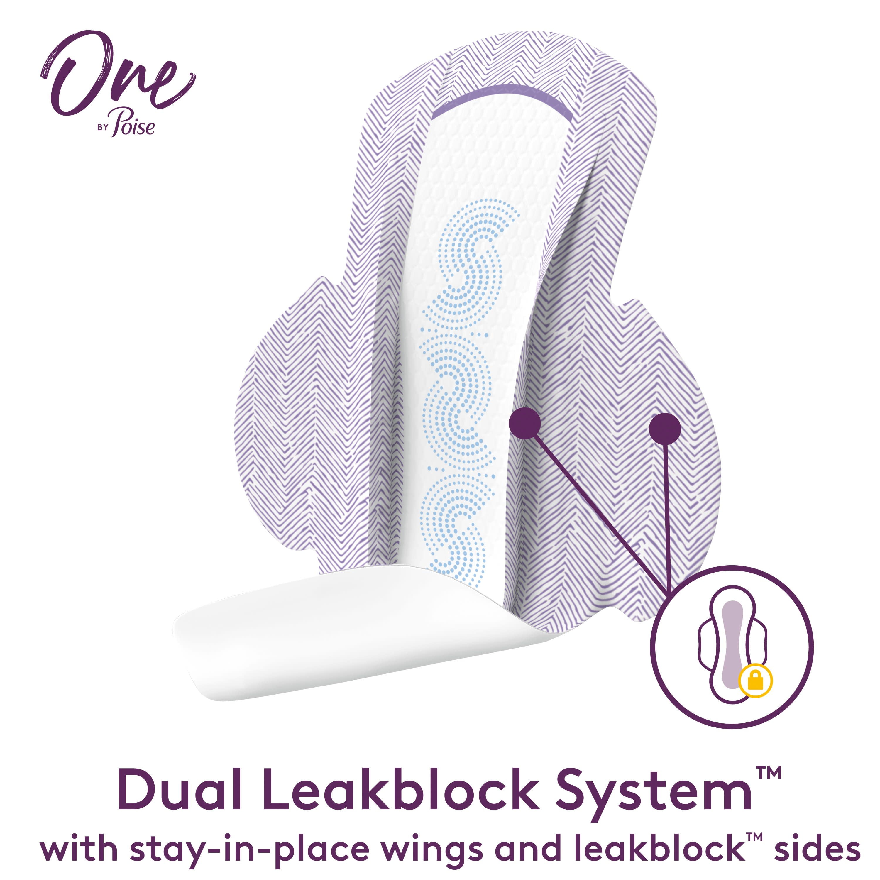 - NEW One by Poise ultra thin feminine pads with wings: featuring a 2-in-1 absorbent core designed specifically to lock away period flow AND bladder leaks in one convenient, discreet, comfortable pad