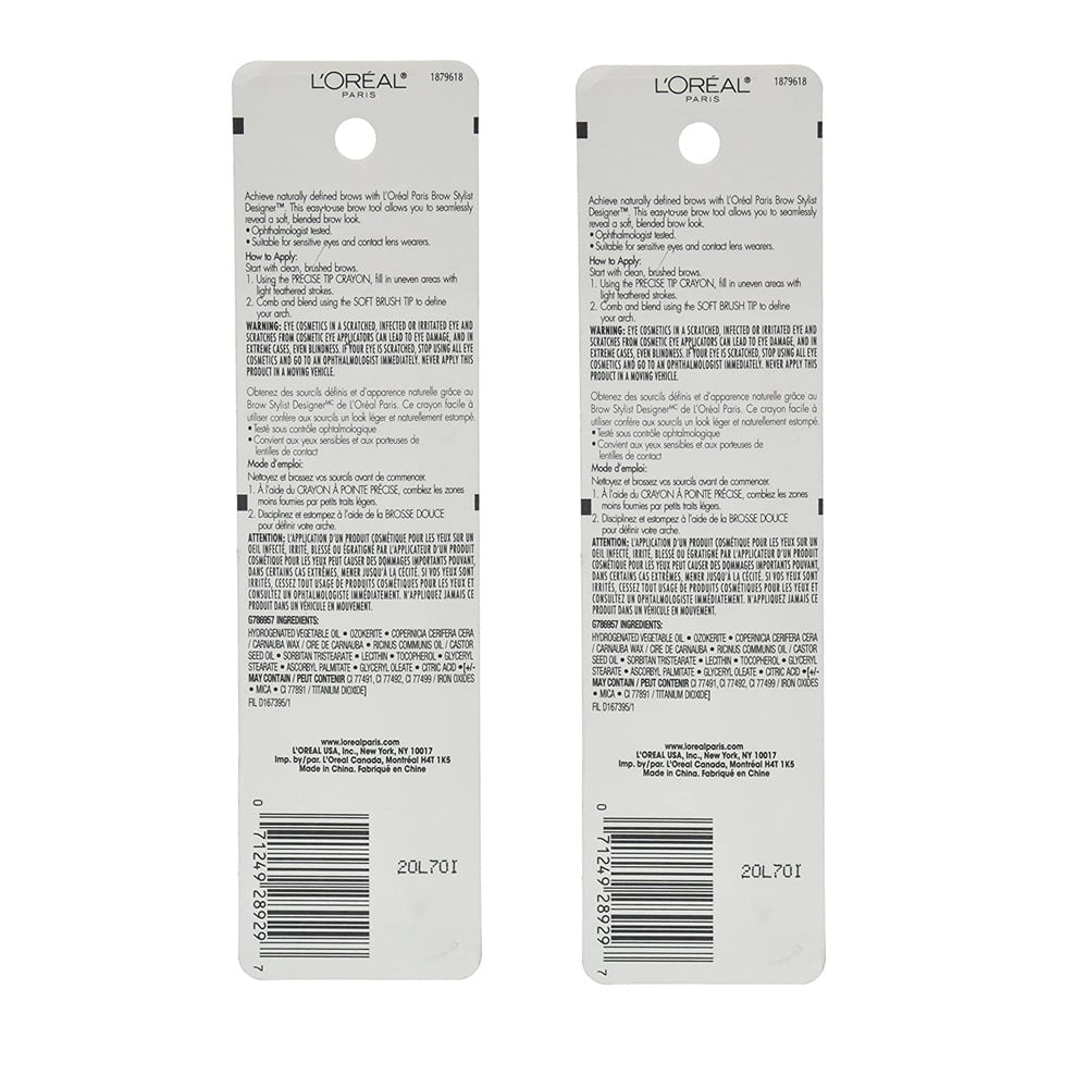 Pack of 2 L’Oreal Paris Brow Stylist Designer Eyebrow Pencil, Dark Brunette # 315 TThe easy-to-use brow tool allows you to seamlessly reveal a soft, blended brow look Achieve naturally defined brows Ophthalmologist tested Suitable for sensitive eyes and contact lens wearers 0.045 oz / 1.3 g x2