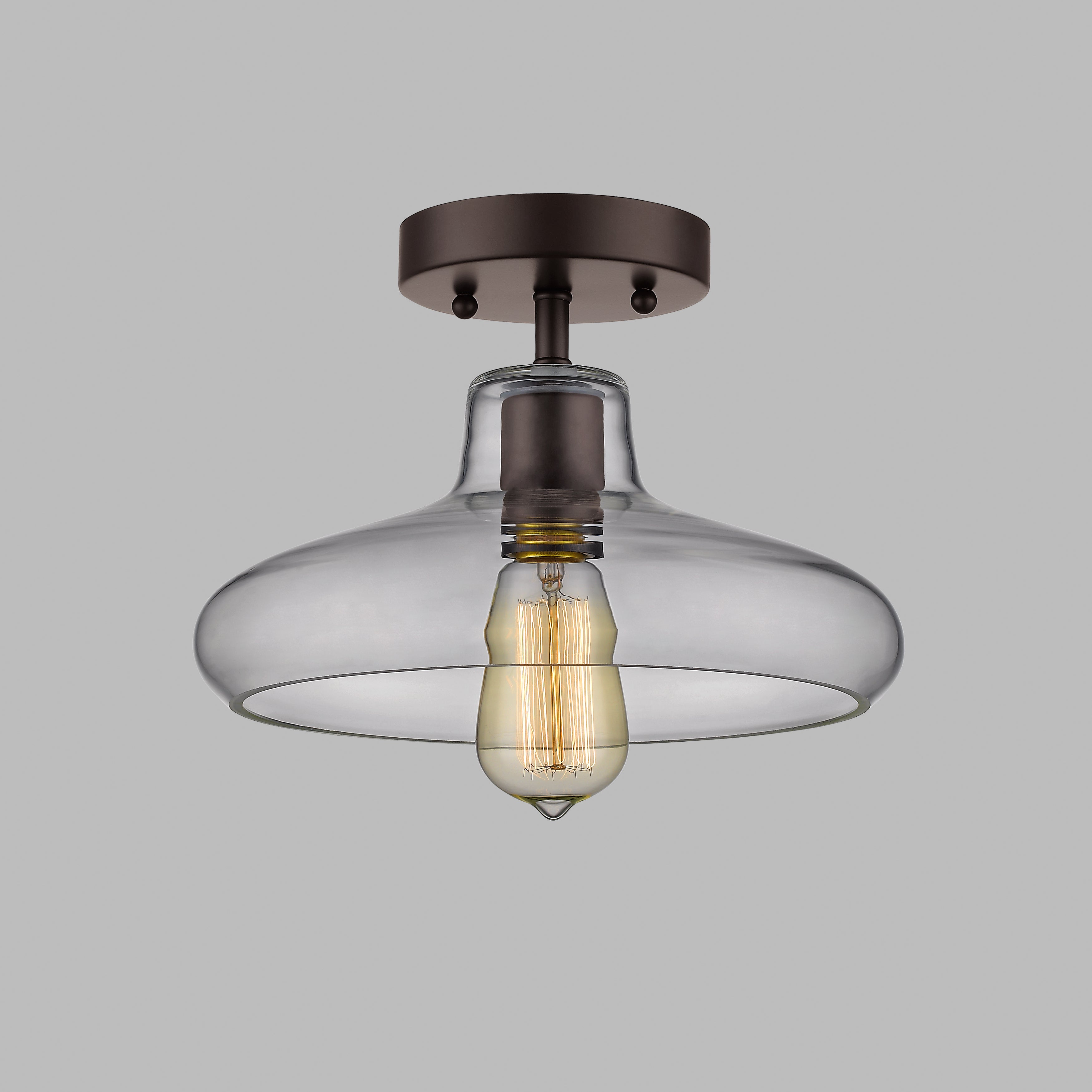 This 1-light semi flush mount features oil rubbed bronze finish that will complement many loft, urban, industrial and transitional decors. The unique shape of the clear glass shade adds interest and showcases the old fashioned 60w Edison bulb included. Dry listed and recommended indoor use only.