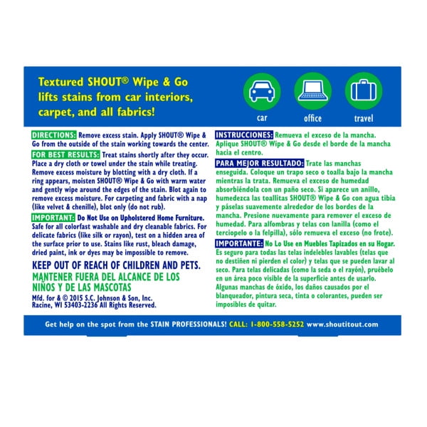 Shout Wipe & Go Instant Stain Remover is tough on stains, but gentle on your color-fast machine-washable fabrics, carpets, and auto interiors. These individually packaged and portable wipes break up stains for easy removal of spontaneous on-the-go stains right away. The textured, double-sided cloth lifts and removes stains like makeup, orange juice, blood, and red wine. Wherever stains happen, Shout Wipe & Go are there. Safe for all colorfast washables and works in all water temperatures. Shout has the stain-fighting ingredients to break up and remove tough stains so you can live in the moment, and clean up later.