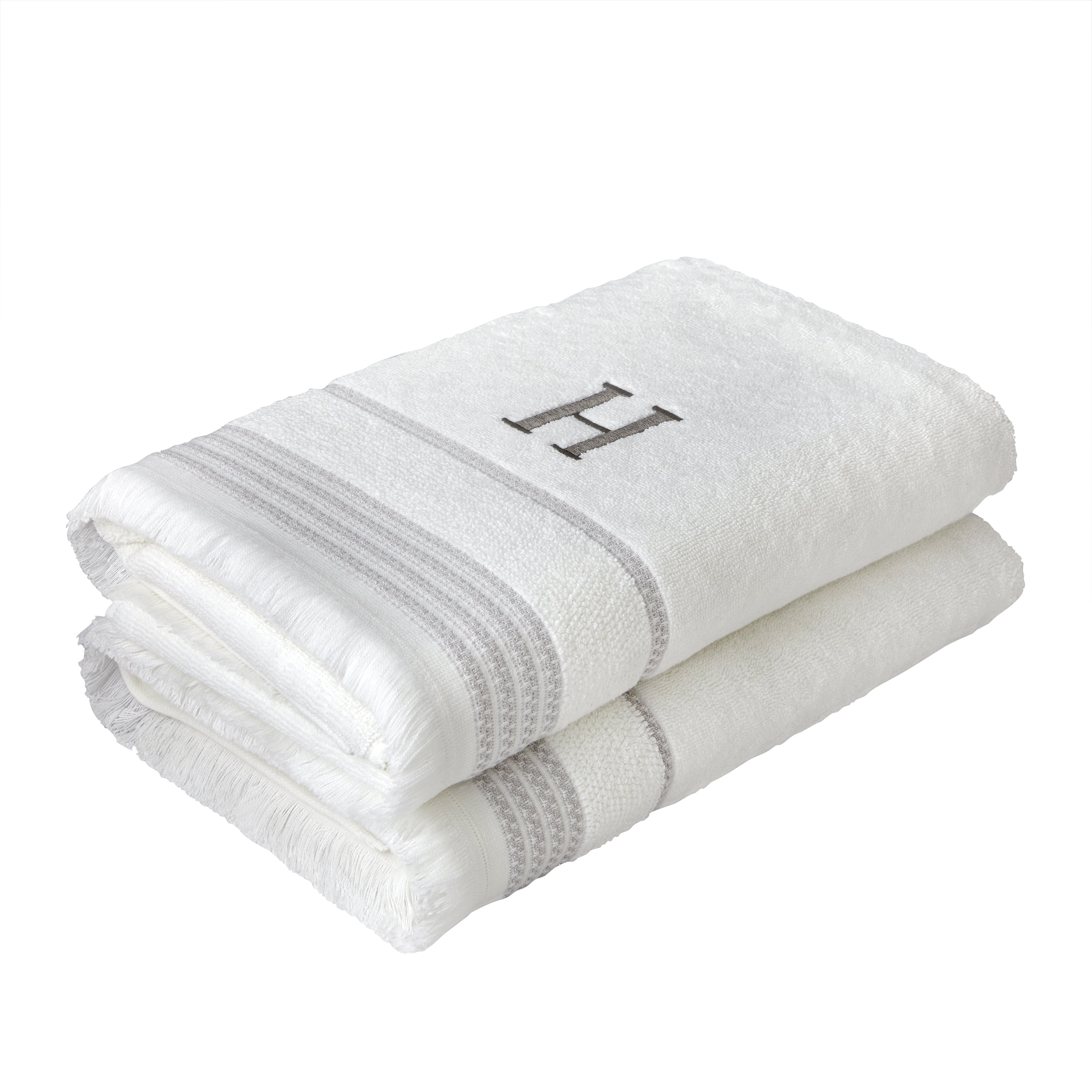 Add some personalization to your daily routine with the Casual Monogram towel collection. This everyday bath towel is made of soft and absorbent cotton terry. It features a single embroidered letter in gray, gray striped trim, a textured terry band, and self-fringe along the hem. This makes a great gift for a wedding/shower, for a new homeowner, or anyone looking for a personalized touch for their space. Coordinating hand towels sold separately.