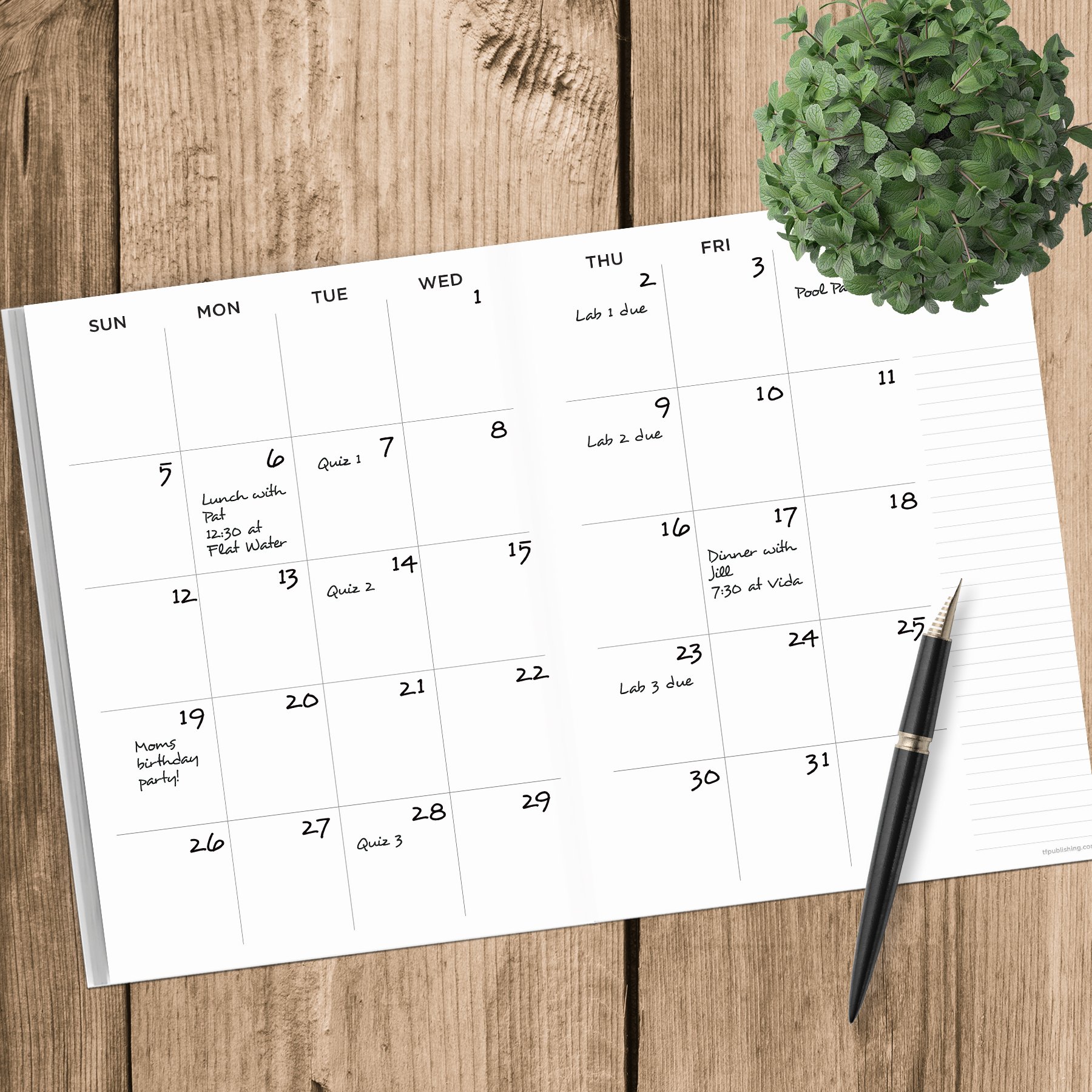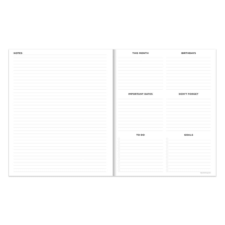 A planner just you need it, anytime of year! Large undated monthly calendar pages are perfect for planning a busy schedule. Each month you begin with a 2-page monthly calendar, followed by a spread for notes, important events, birthdays and additional lists. Complete with a clean and colorful cover design in a textured material. This 11" (h) x 9" (w) undated monthly planner is perfect any time of year.
