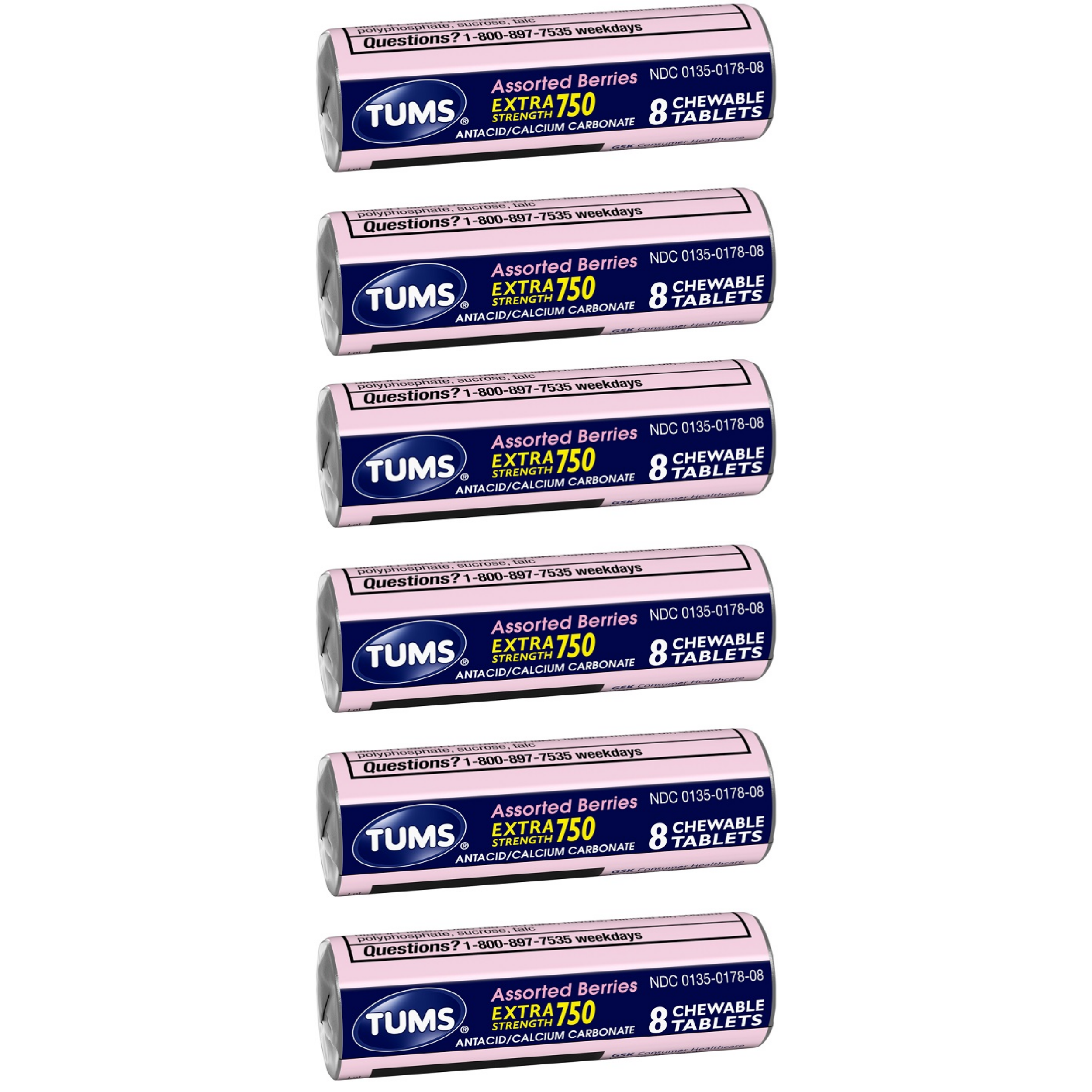 Tums Extra Strength 750 Assorted Berries Antacid Chewable Tablets for Heartburn Relief,8 Tablets Each Roll,(6 Pack)
