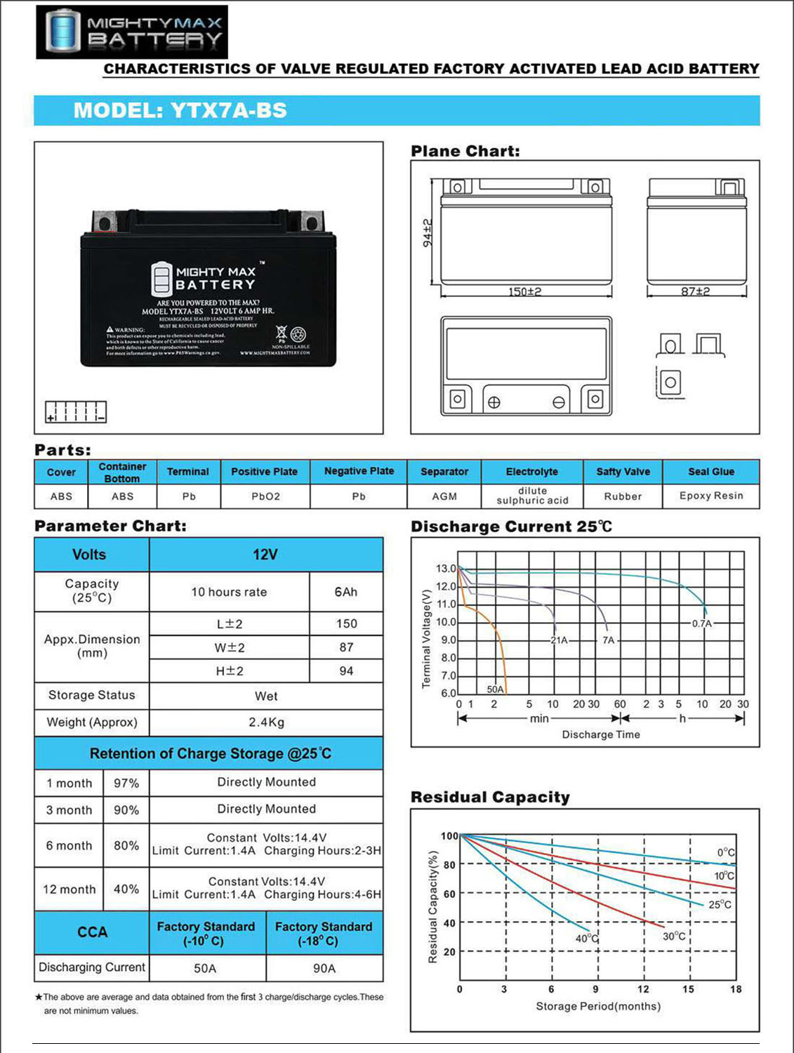 - YTX7A-BS is a 12V 6AH 105 Cold Cranking Amps (CCA) Sealed Lead Acid (SLA) Battery