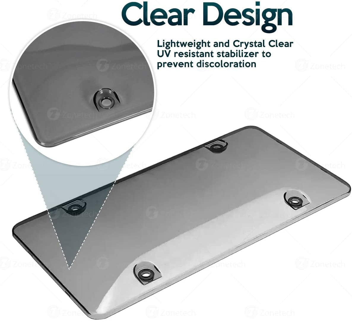 - ► CLEAR BUBBLE DESIGN – The Zone Tech license plate shields are lightweight and crystal clear. So clear you can’t even tell the license plate has a cover. The clear cover is virtually indestructible. It will not break or shatter. This offers a top of its class in license plate protection.