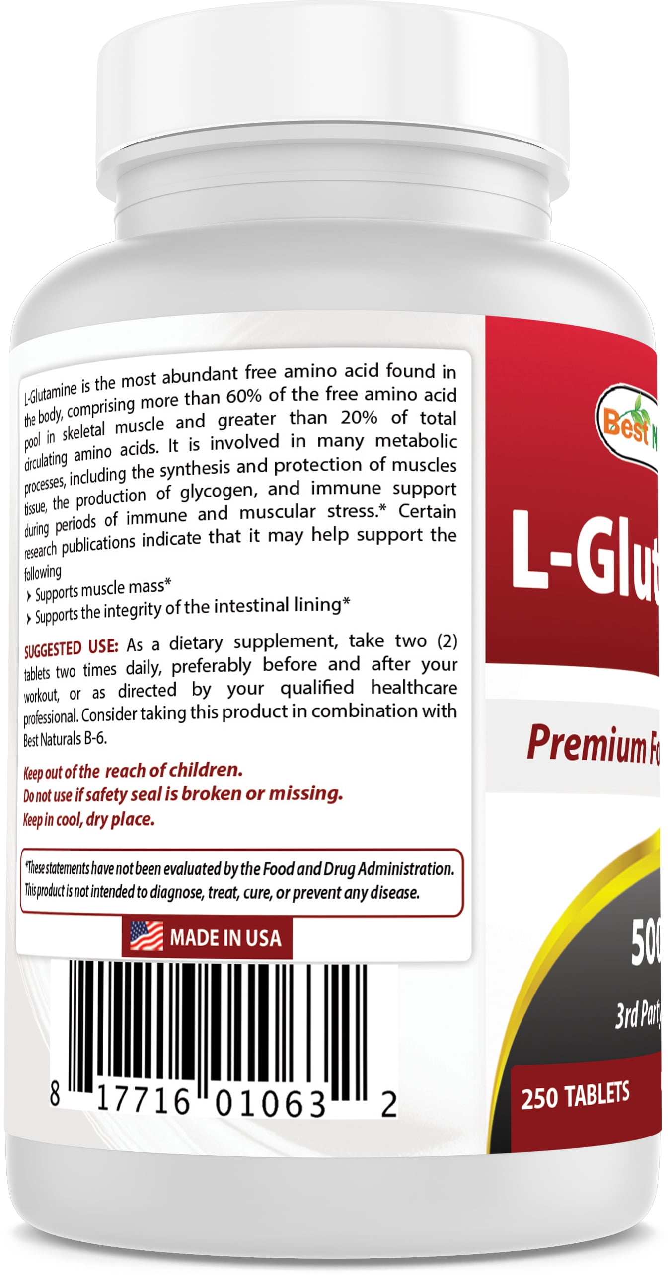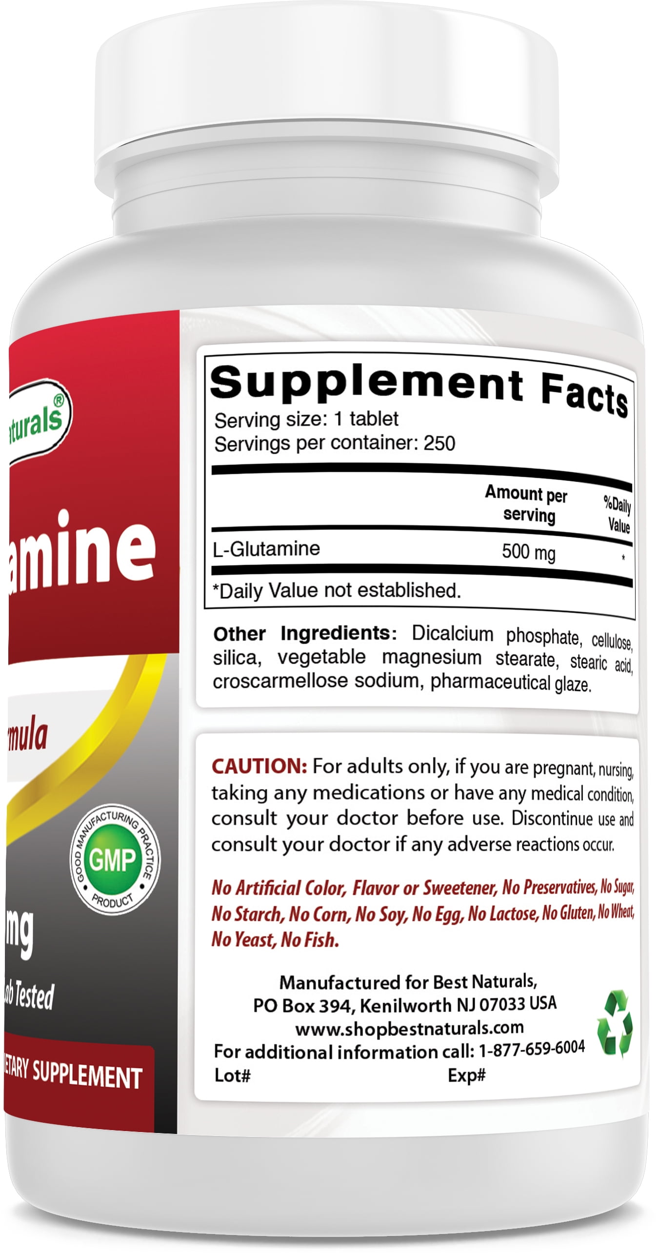 - Glutamine 500 mg per tablet – 250 Glutamine tablets per bottle.