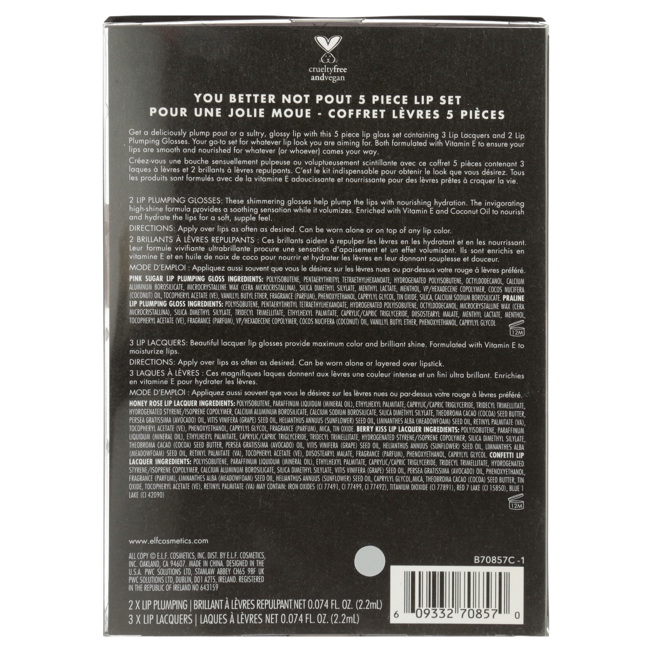 Get a deliciously plump pout or a sultry, glossy lip with e.l.f.’s You Better Not Pout, 5 Piece Lip Set . The gift set contains 3 Lip Lacquers and 2 Lip Plumping Glosses. Your go-to set for whatever lip look you are aiming for. Both formulated with Vitamin E to ensure your lips are smooth and nourished for whatever (or whoever) comes your way. Proud to be 100% vegan and cruelty-free, worldwide. Because kindness is chic.