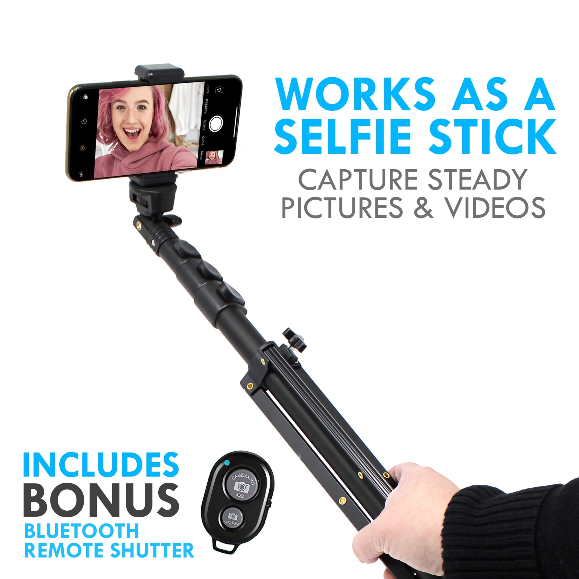 The 2-in-1 selfie stick with built-in wireless remote control, it is easy to take selfie-photography or group photos, suitable for parties, travel, hiking, etc. Also, you can use it as a quick and easy tripodOur Phone Tripod Stand has a 225°rotation head with an adjustable knob + 360°rotatable phone holder you could rotate the phone clip and select horizontal or vertical camera mode to get the best angle photosThis upgraded aluminum alloy selfie stick can extend the length between 17.5-51 inches for more intimate shots and wider angles, allowing you to catch more scenery in every pictureThis foldable selfie stick tripod for iPhone and Android was designed to eliminate this to make an ordinary Selfie Stick lighter but more functional. You can easily carry it anywhereAduro U-Stream Selfie Stick 51��� Extendable Tripod w/ Bluetooth Remote