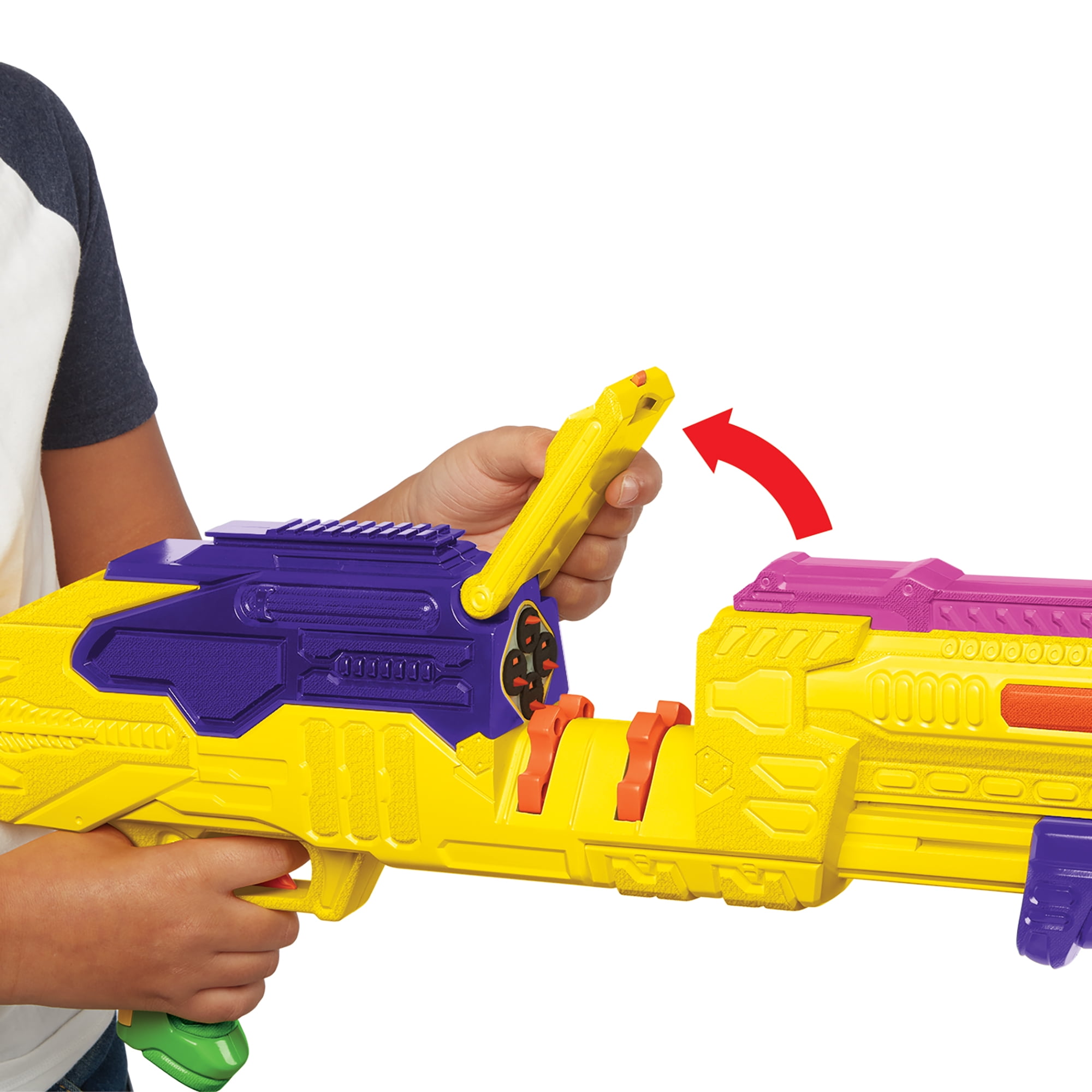 Adventure Force Tetrashot Dart Belt Blaster allows for the ultimate belt blasting action. Fill the 48 capacity dart belt with darts and load the dart belt into the blaster. Pull back the pump handle; push it forward and then squeeze the trigger to launch your darts up to 90 feet. It comes with one 48 capacity round dart belt that will keep you in the action longer with its auto-advancing feature, so you can hit your targets without reloading. The dart belt is adjustable for various lengths, so you can customize your round size. Get into the action with the Adventure Force Tetrashot Dart Belt Blaster.