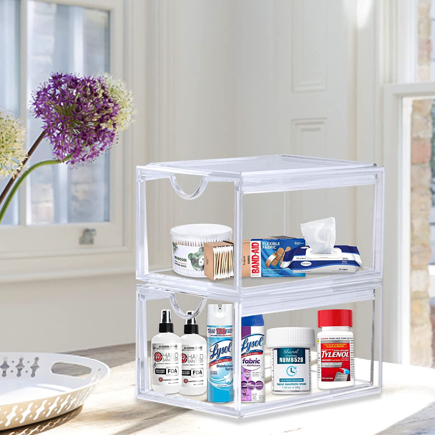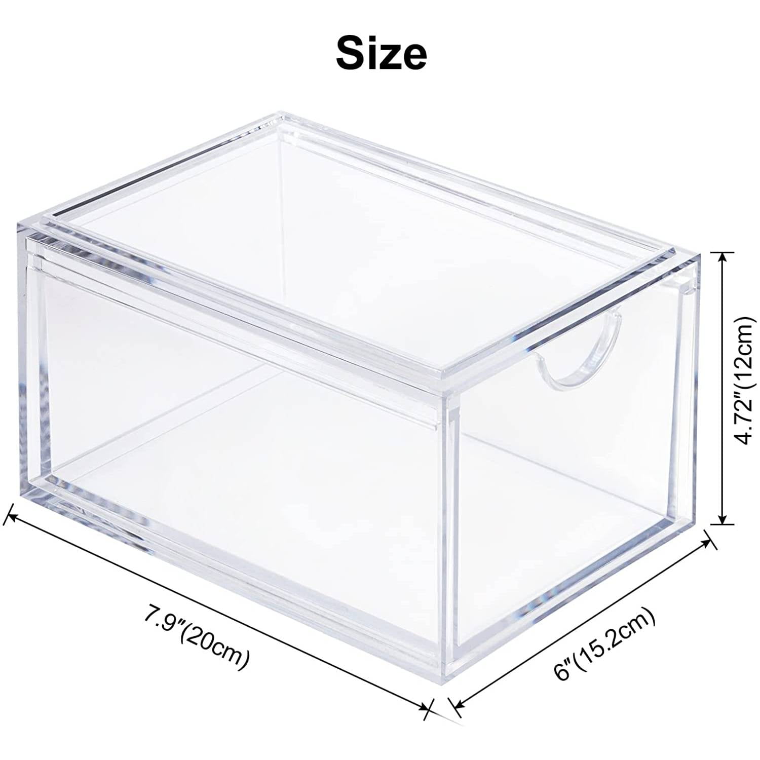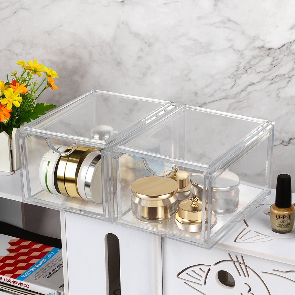 - [Stackable Design] Come with 2pcs drawer storage organizers, each organizer measures 10.3”L x 8.2”W x 6.3”H. The storage containers are stackable, vertical storage will save a lot of space. You can also use them side by side. Put your small objects on top of acrylic bins to make your countertop space more tidy.