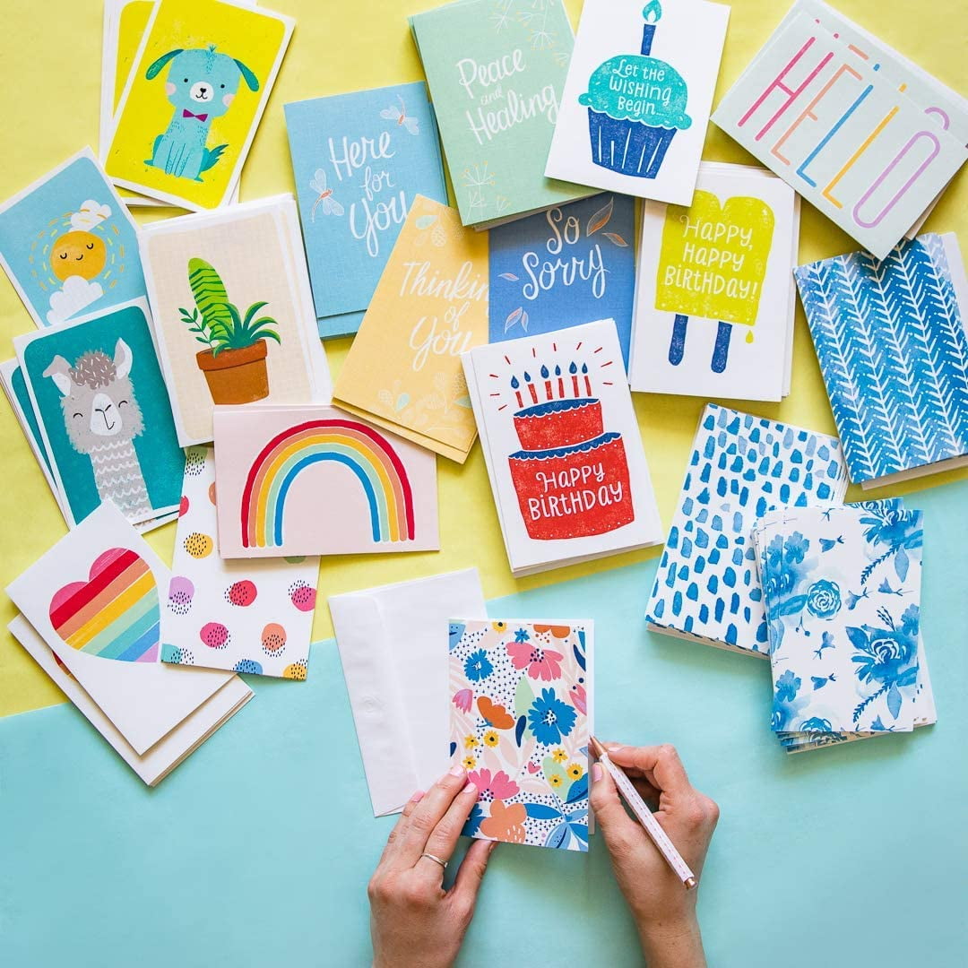 - This bulk greeting cards assortment features a variety of playful patterns across colorful blank note cards with space to write a cheerful message