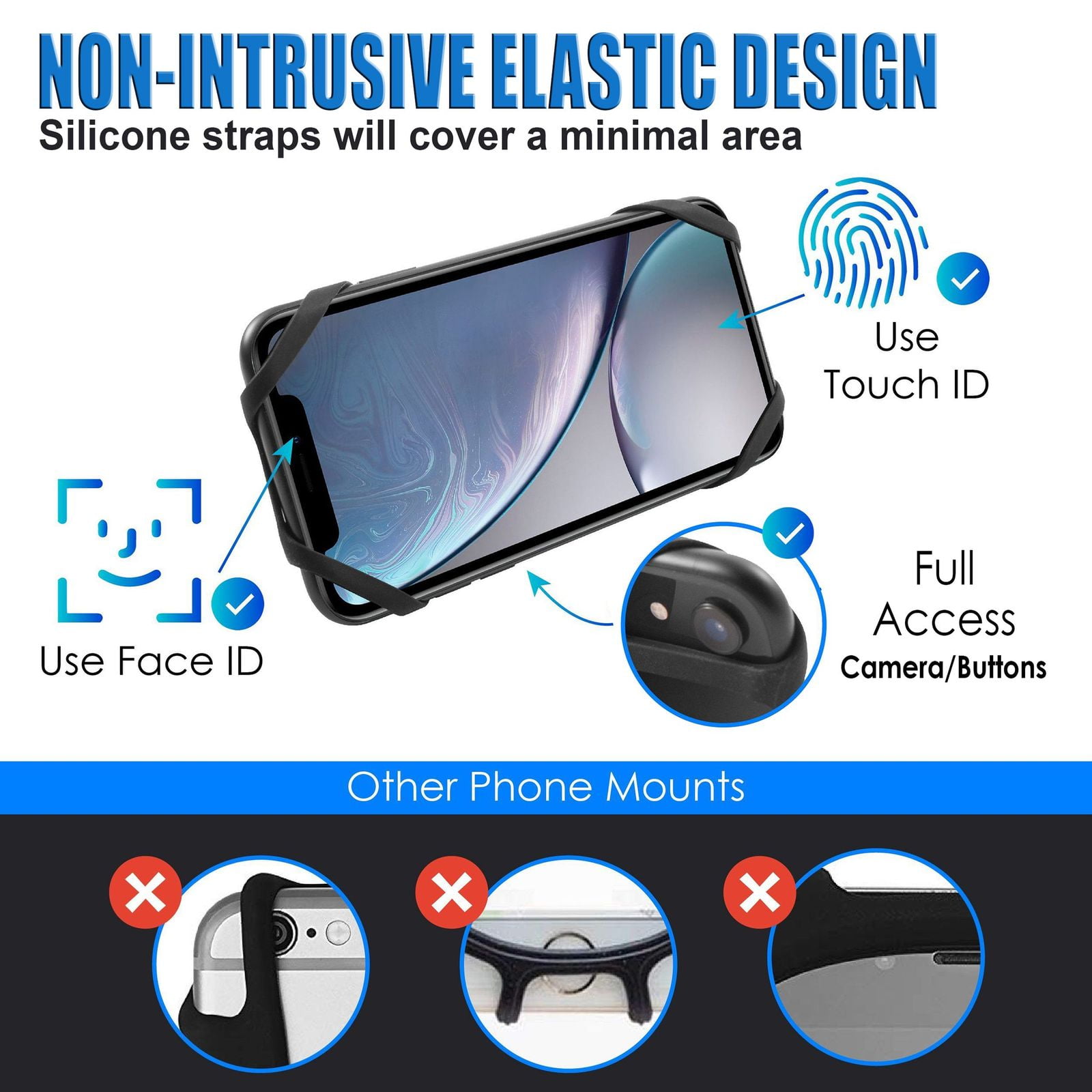 - SMART SILICONE BANDS: Silicone bands wrap around the corners of your phone, covering minimal area. Receive a full-frontal display with no impact on Face-ID or fingerprint scanners. High-quality silicone bands are flexible and durable