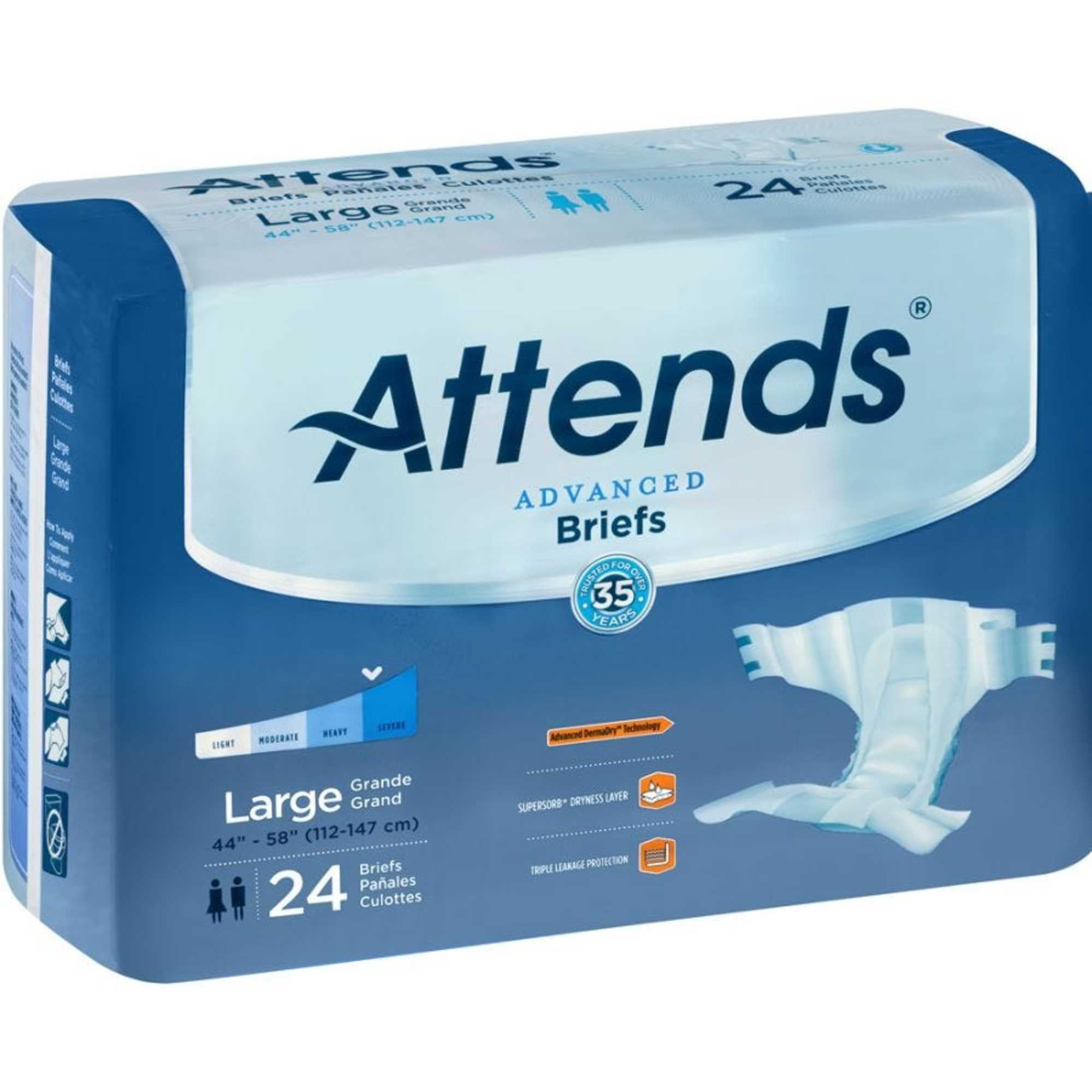 Attends DermaDry Complete Brief is an innovative design providing the ultimate performance and fit while remaining economically and environmentally sustainable. The top surge core features rapid fluid acquisition to wick fluid away from the body and keep skin drier and healthier. The acquisition layer works in tandem with embossed channeling to quickly pull and direct fluid away from the skin and into the core. It features high performance and triple-layer core that stays dry and maintains integrity through multiple voids.New improved inner anti-leak barrier leg cuffs of Attends Brief provide the ultimate defense against leaks.Rapid Lock Dual Core channels and locks fluids away swiftly to help manage urine odors by neutralizing ammonia, providing users added discretion and dignity.The cloth-like fabric is gentle to the touch and features breathability zones that allow sweat and moisture to evaporate, promoting dryness and skin wellness.Tear away sides of this Incontinence Brief make removal quicker and easier than ever before.The cloth fabric is less noisy against clothing for added concealment.Breathable fabric with superior softness delivers comfort and skin wellness.Features:-The top surge core features rapid fluid acquisition to wick fluid away from the body and keep skin drier and healthier.-New improved inner anti-leak barrier leg cuffs provide the ultimate defense against leaks.-New, improved tear away sides make removal quicker and easier than ever before.-The cloth-like fabric is gentle to the touch and features breathability zones that allow sweat and moisture to evaporate, promoting dryness and skin wellness.-The cloth fabric is less noisy against clothing for added concealment.-Rapid Lock Dual Core channels and locks fluids away swiftly to help manage urine odors by neutralizing ammonia, providing users added discretion and dignity.