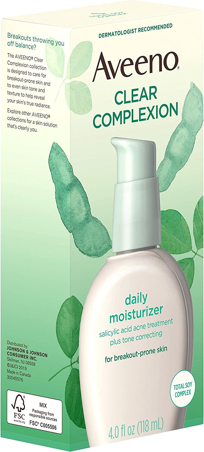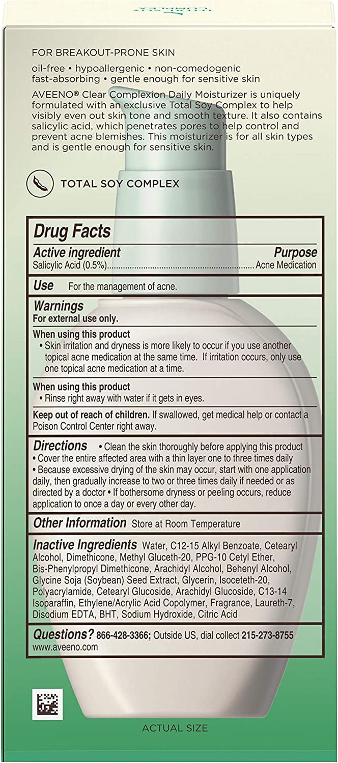 The AVEENO brand has been dermatologist recommended for nearly sixty years. Active Ingredients: Salicylic Acid 0.5% Inactive Ingredients: Arachidyl Alcohol; Arachidyl Glucoside; Behenyl Alcohol; BHT; Bis-Phenylpropyl Dimethicone; C12-15 Alkyl Benzoate; C13-14 Isoparaffin; Cetearyl Alcohol; Cetearyl Glucoside; Dimethicone; Disodium EDTA; Ethylene/Acrylic Acid Copolymer; Fragrance; Glycerin; Glycine Soja (Soybean) Seed Extract; Isoceteth-20; Laureth-7; Methyl Gluceth-20; Polyacrylamide; PPG-10 Cetyl Ether; Water Uses: For the treatment of acne. Oil-free, hypoallergenic, noncomedogenic. This daily moisturizer has a unique formula with an exclusive Total Soy Complex to help naturally even out skin tone and smooth texture. It also contains salicylic acid to help clear up and prevent blemishes. This fast-absorbing moisturizer is gentle enough for sensitive skin and helps maintain healthy-looking skin and improve your complexion.