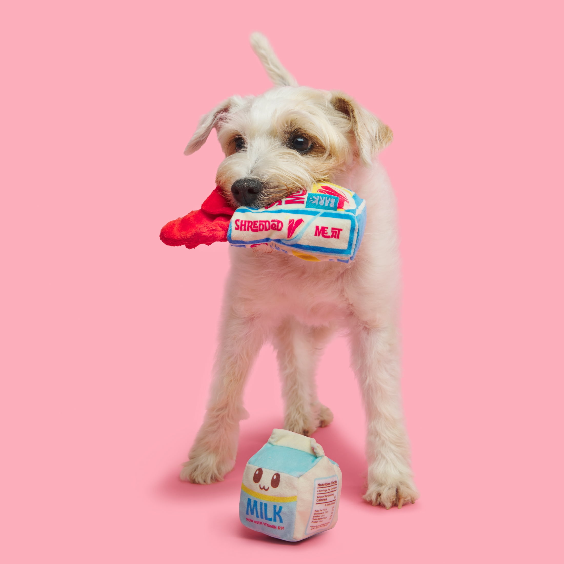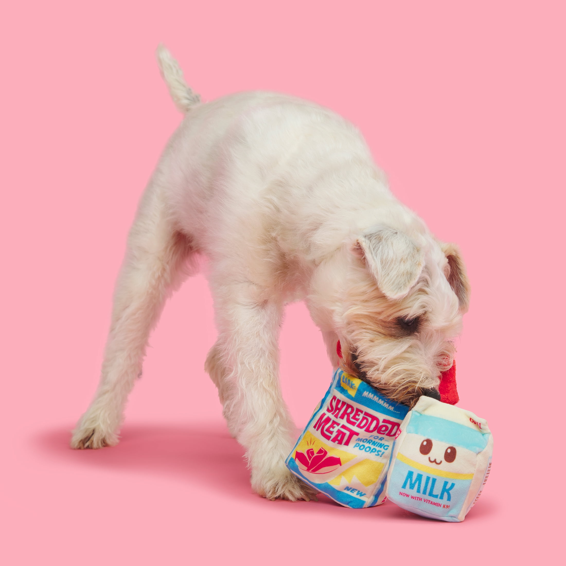This milk and cereal dog toy duo is a full serving of fun! Balanced Breakfast has all the ingredients your pup needs to start the day off right with a bite. This Dynamic duo features two squeakers and crazy crinkle; sounds you’ll want to hear all day long. As opposed to milk being slurped out of a bowl. This BARK original toy is part of the Barkfest in Bed collection and is part of a complete playtime. Made by dog people, for dogs and their people, backed by BARK’s Happiness Guarantee.
