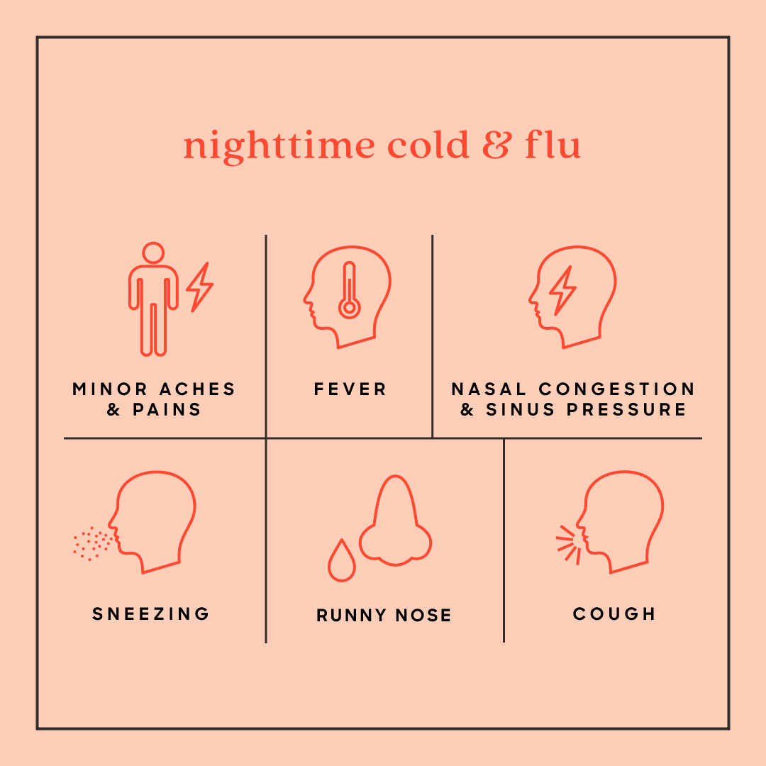 - COLD & FLU NIGHTTIME RELIEF: One dose provides nighttime relief for minor aches and pains, fever, nasal congestion, sinus pressure, sneezing, runny nose and cough.